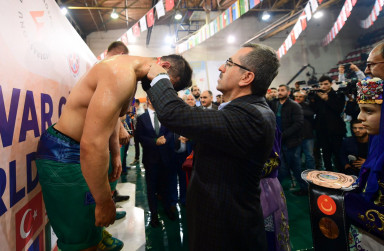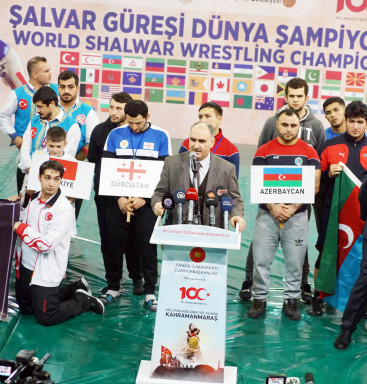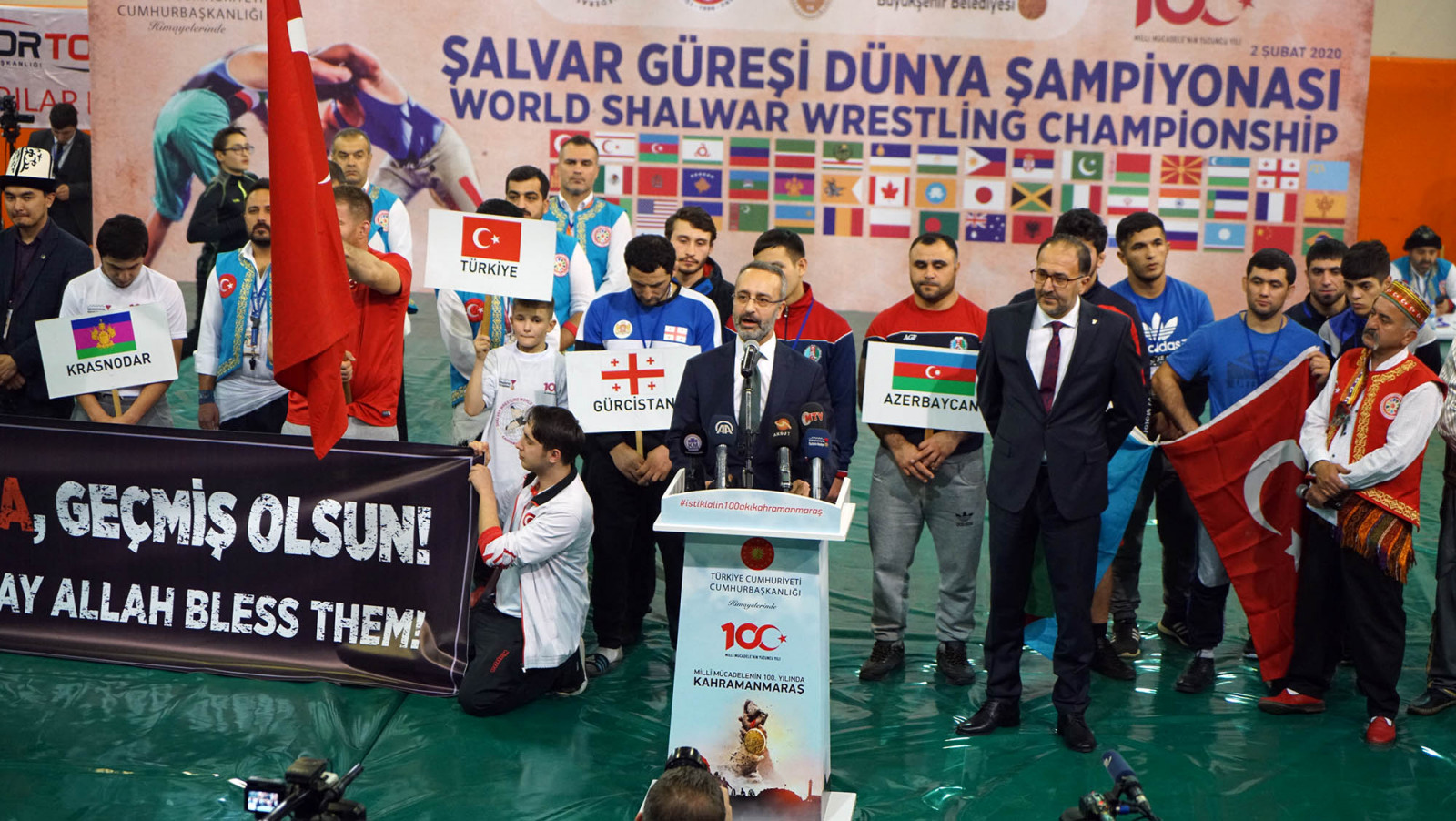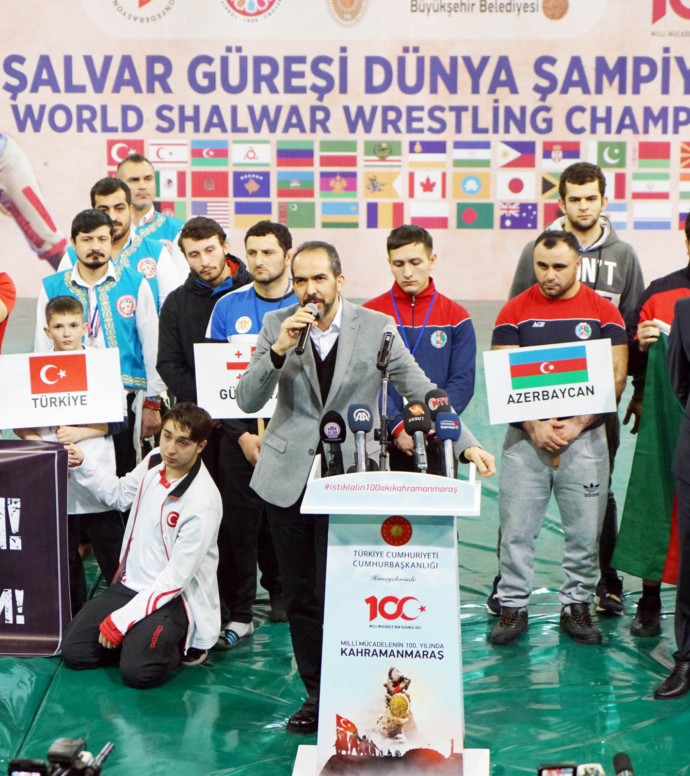 Şampiyonada bir konuşma yapan Kahramanmaraş Büyükşehir Belediye Başkanı Hayrettin Güngör, ata sporu güreşin tarihinin çok eskilere dayandığını ifade ederek: “ETNO Spor Konfederasyonu ve Geleneksel Spor Dalları Federasyonu işbirliği ile gerçekleştirdiğimiz Şalvar Güreşi Dünya Şampiyonası’nın, Milli Mücadele’nin 100. Yılı Kutlama Etkinlikleri kapsamında yapılması, hususi bir anlam ve öneme sahiptir. Ata sporumuz güreşte, ecdadımızın cesaretini, “mazlumun yanında, zalimin de karşısında duran” yiğitliğini görmek mümkündür. Kahramanmaraş’ta güreş müsabakaları 17 yıldır turnuva ve festival şeklinde gerçekleştiriliyordu. Biz bunu 100. Yıla özel Dünya Şampiyonasına dönüştürdük. ETNO Spor Konfederasyonu ve Geleneksel Spor Dalları Federasyonu’na, bu ortak çalışmadan dolayı teşekkür ederim. Şampiyonaya Azerbaycan, Brezilya, Bosna-Hersek, Hindistan, Arnavutluk, Kırgızistan, Pakistan, Rusya, İran, Kazakistan, Özbekistan, Japonya, Kanada gibi 46 farklı ülkeden 300 sporcu katılıyor. Dünyanın dört bir yanından gelen sporcularımızı, Kahramanmaraş’ta misafir etmekten sevinç duyuyoruz. Bu yılın diğer bir farkıysa, Altın Kemerli Kırkpınar Başpehlivanı İsmail Balaban’ın aramızda bulunması, ayrıca müsabakalara katılacak olmasıdır” diye konuşarak şampiyonaya katılan tüm güreşçilere başarılar diledi.