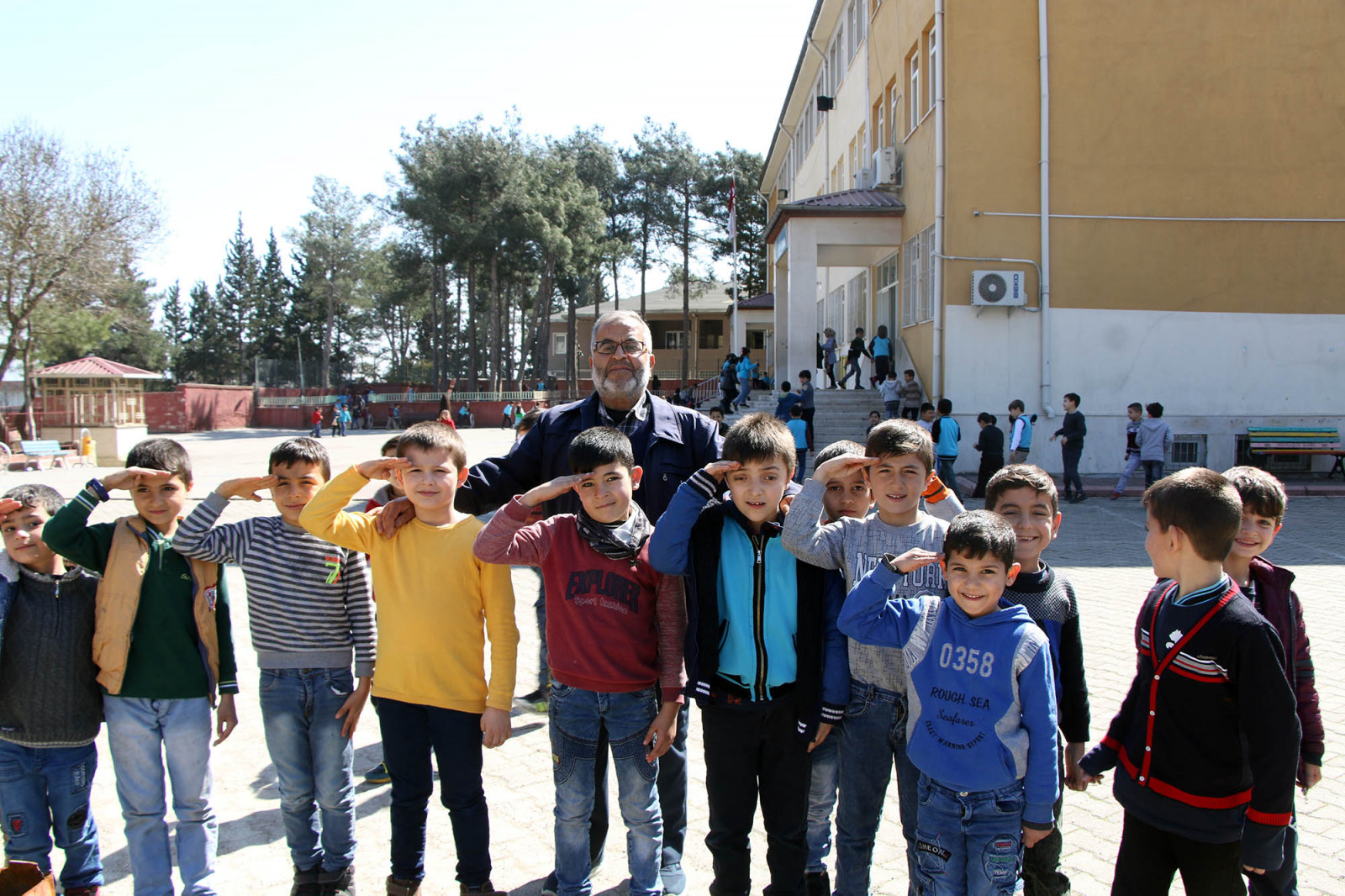 Okullarının bahçesindeki istinat duvarının yapılmasından memnun olan öğrenciler, asker selamı durarak İdlib’de devam eden operasyonlardaki Mehmetçiklerimize selam gönderdiler.