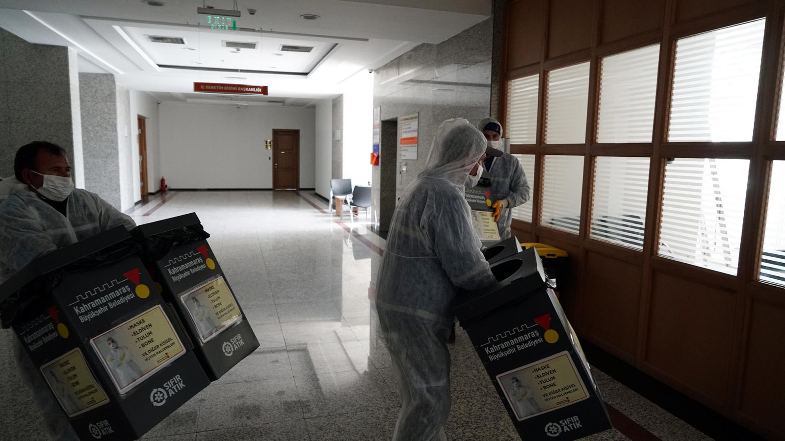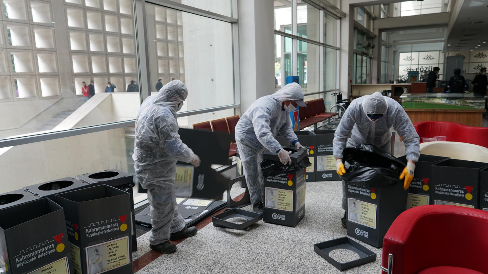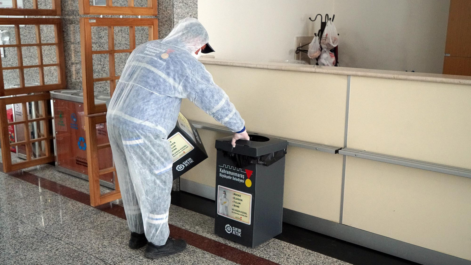 Kahramanmaraş Büyükşehir Belediyesi Çevre ve Şehircilik Bakanlığı tarafından yayınlanan genelgeye ilişkin olarak kişisel olarak kullanılan tek kullanımlık eldiven, maske, bone ve tulum gibi hijyen malzemelerin toplanacağı kutuları bina içerisine yerleştirdi.