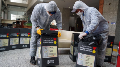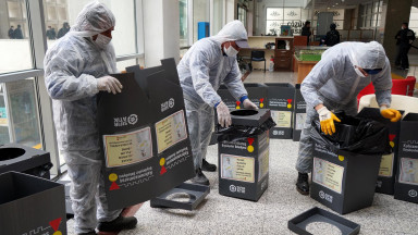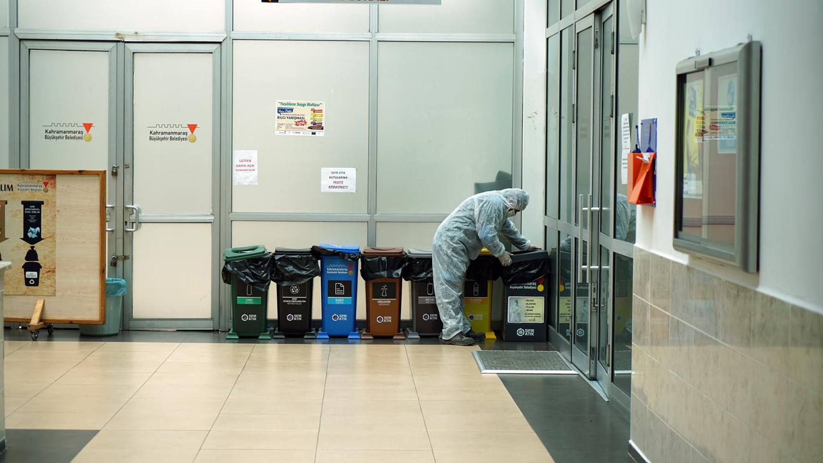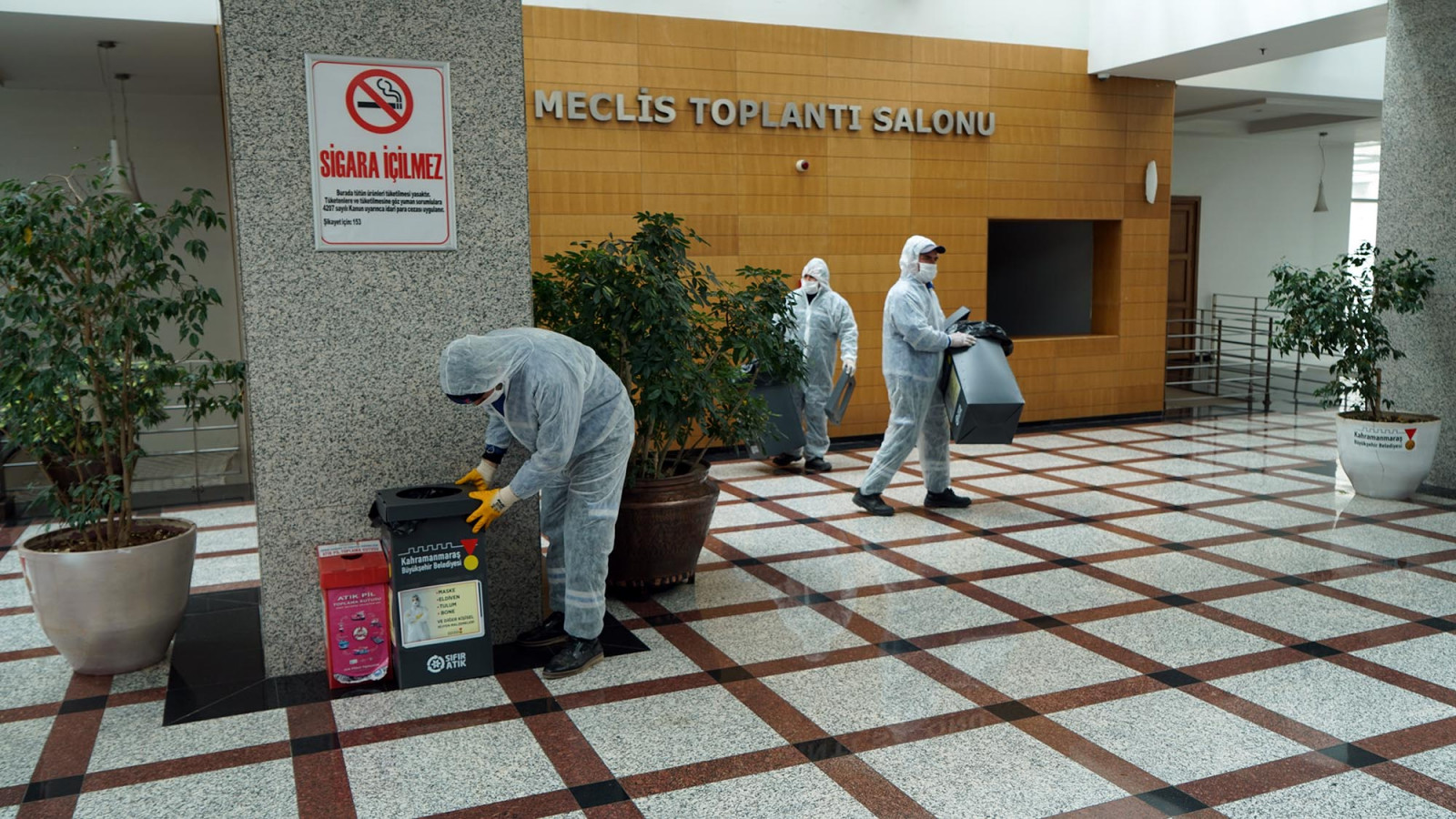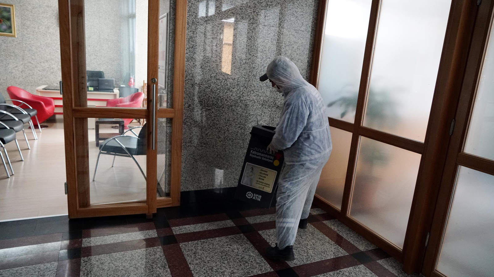 Kahramanmaraş Büyükşehir Belediyesi Çevre ve Şehircilik Bakanlığı tarafından yayınlanan genelgeye ilişkin olarak kişisel olarak kullanılan tek kullanımlık eldiven, maske, bone ve tulum gibi hijyen malzemelerin toplanacağı kutuları bina içerisine yerleştirdi.
