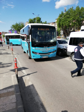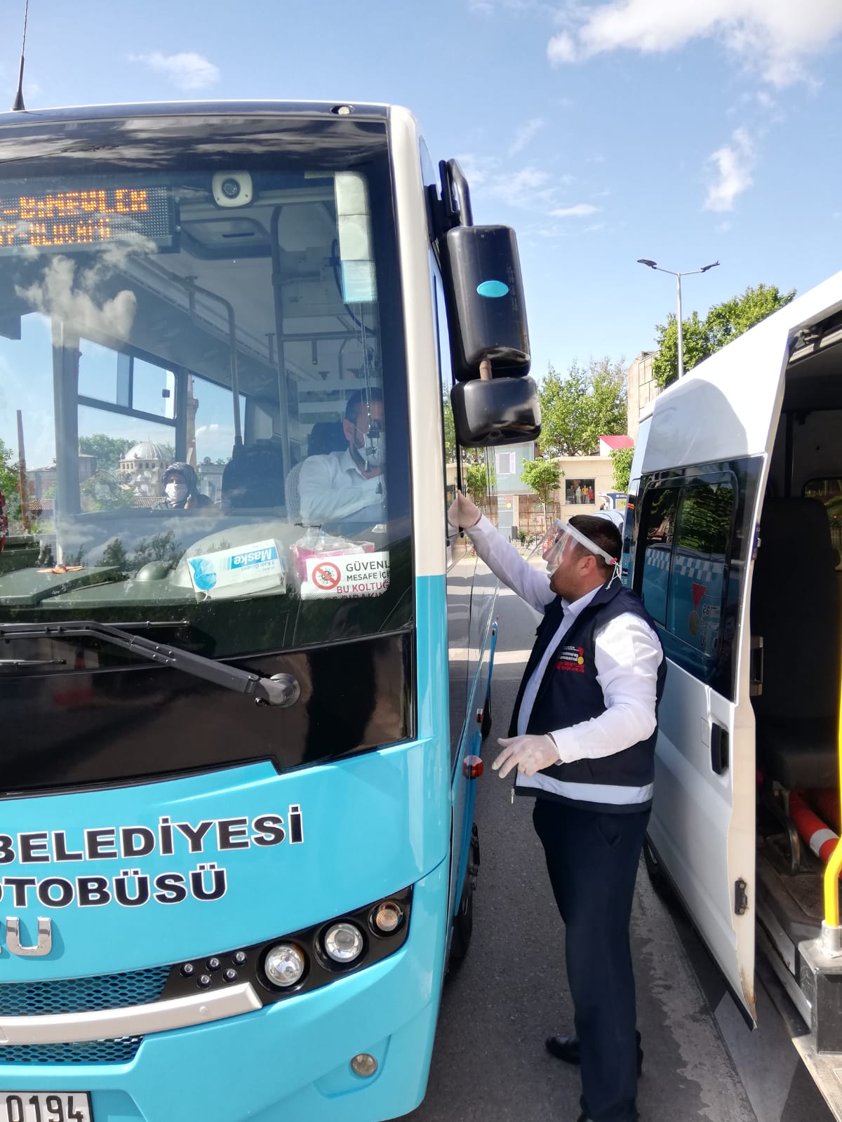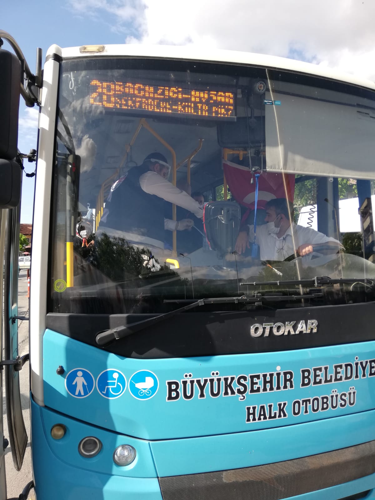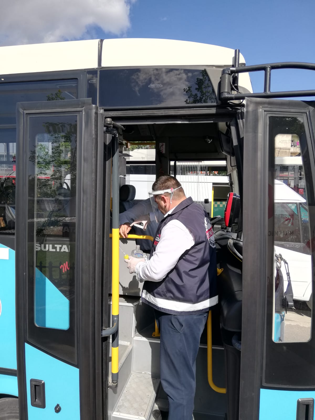 Toplu taşıma araçlarını kullanan vatandaşların hizmetine yönelik halk otobüslerine monte edilen el dezenfektan dispanserlerini kontrol eden ekipler dezenfektan teminini gerçekleştiriyorlar.