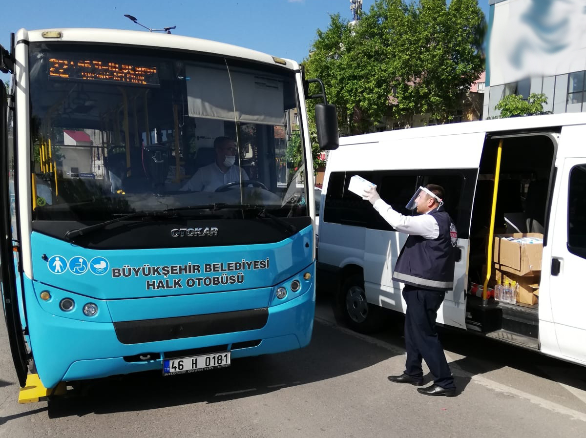 Kahramanmaraş Büyükşehir Belediyesi, toplu taşıma araçlarında maske dağıtımı ve el dezenfektan teminine devam ediyor.