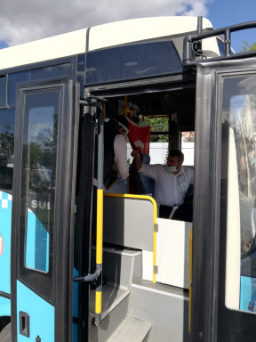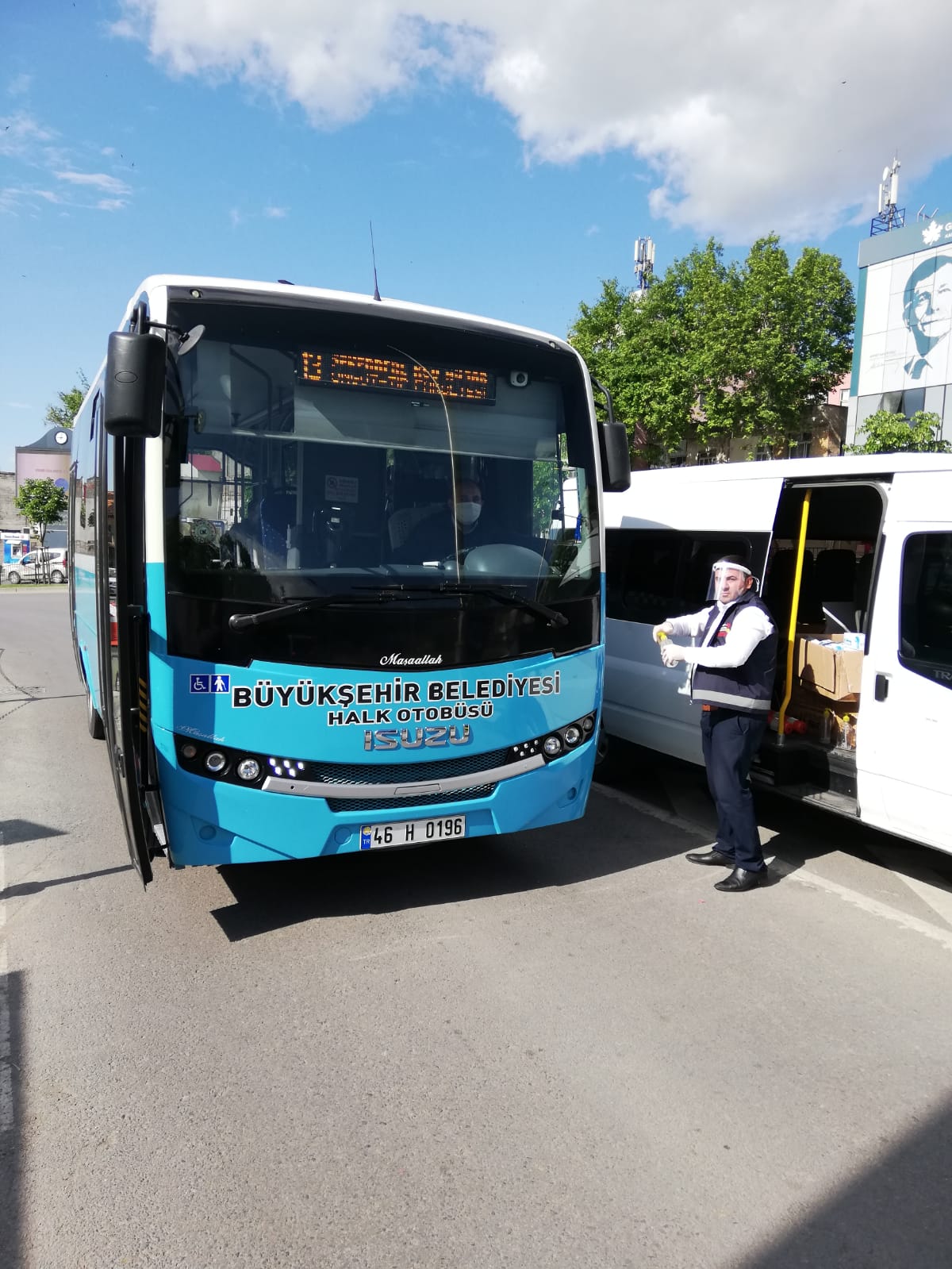 Büyükşehir Belediyesi Ulaşım Dairesi Başkanlığı Toplu Taşıma Şube Müdürlüğü ekipleri toplu taşıma araçlarında kullanılan el dezenfektan dispanserlerine dolum yaparken aynı zamanda ücretsiz maske dağıtıyor.