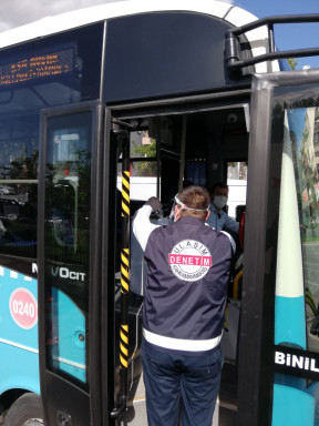 İçişleri Bakanlığının yeni tip koronavirüse karşı aldığı önlemler kapsamında toplu taşıma araçlarındaki yolcu taşıma kapasitesinin yarısı kadar yolcu taşımaya müsaade edilmektedir. Bu kapsamda ilimizde özel halk otobüsleri bu süreçte 24 yolcu taşıma müsaadesi bulunmaktadır. Ekiplerimiz toplu taşıma araçlarının fazla yolcu alıp almadığı, yolcuların maske takıp takmadıkları, araç içerisinde sosyal mesafe kurallarında uyarılması konusunda çalışmalarına aralıksız olarak devam etmektedir” denilerek bilgi verildi.