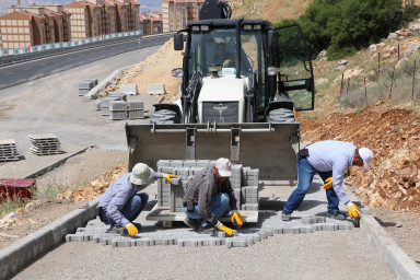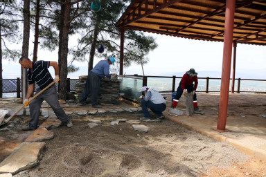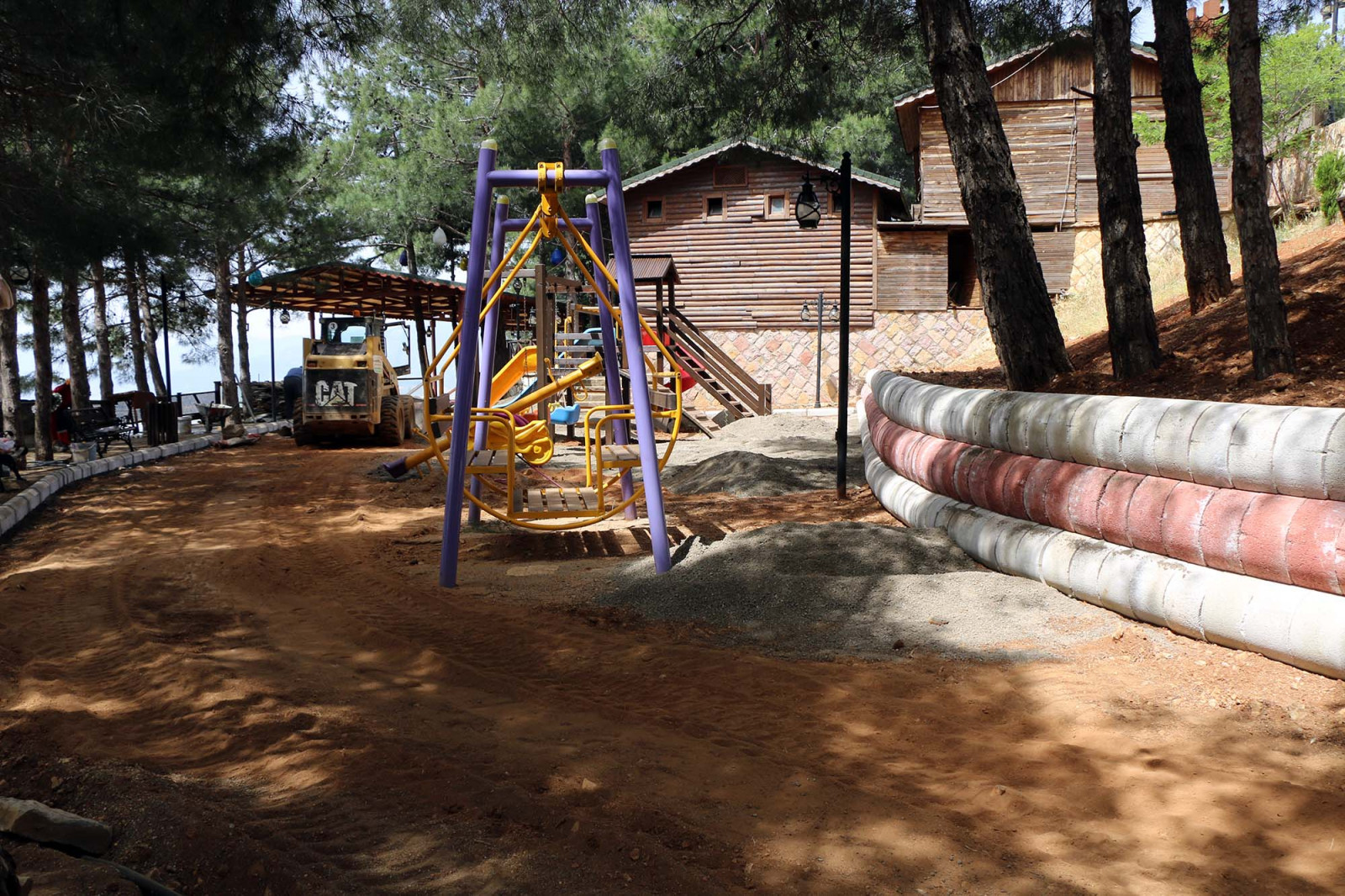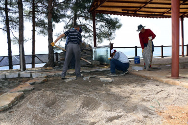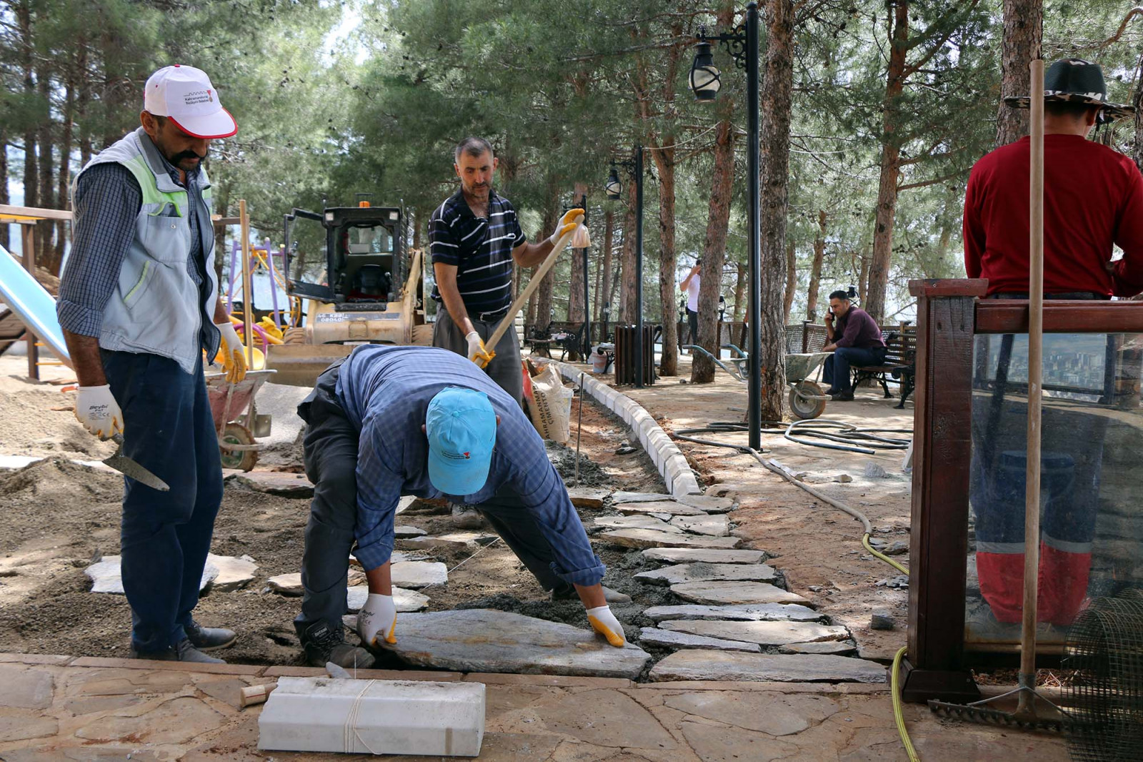 Seyir terasına ulaşımı sağlayanca yeni yol ve yaya yolunda kilit parke döşeme çalışmalarının yanı sıra seyir terası içerisinde yer alan zemin döşemesinde ve çocuk parkında yenileme çalışmaları devam ediyor.