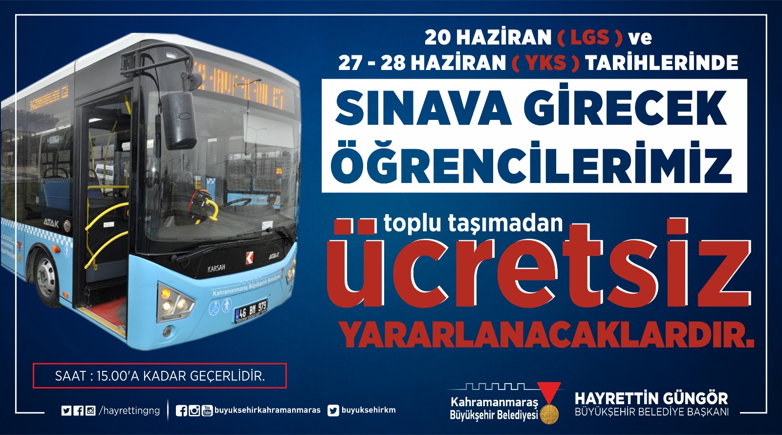 Kahramanmaraş Büyükşehir Belediyesi Ulaşım Hizmetleri Dairesi Başkanlığı’ndan yapılan açıklamada: “Bu hafta sonu yapılacak olan LGS Sınavına girecek tüm öğrencilerimize toplu taşıma araçlarımız saat 15.00’e kadar ücretsizdir. Büyükşehir Belediyesi otobüsleri ve özel halk otobüsleri sınava girecek öğrencilerimizi saat 15.00’e kadar ücretsiz taşıyacaklar. Saat 15.00’den sonra ise normal akış süreci devam edecektir” denilerek bilgi verildi.