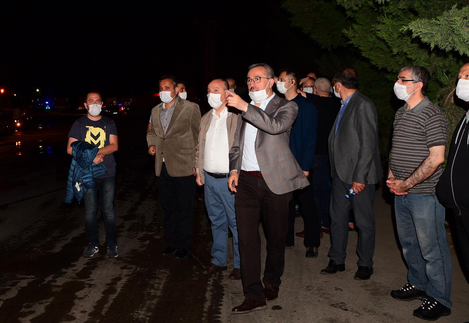 Kahramanmaraş Büyükşehir Belediye Başkanı Hayrettin Güngör, Gaziantep Yolu üzerinde tekstil fabrikasında çıkan yangını söndürme çalışmalarını Vali Ömer Faruk Coşkun ile birlikte incelemelerde bulundu.