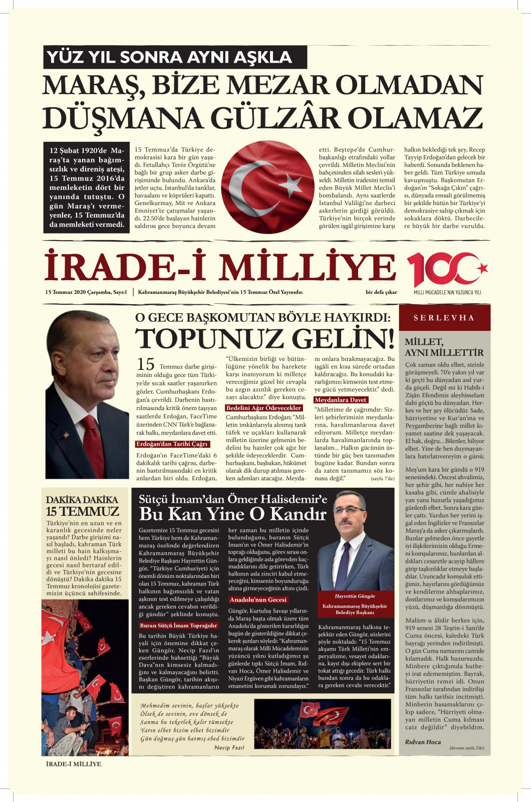 Şeyh Adil Mezarlığı’nda şehitlik ziyaretinin ardından İrade-i Milliye Gazetesi ile alakalı bir açıklamada bulunan Başkan Güngör: “Bugün 15 Temmuz’un 4. Yıldönümü. Aynı zamanda Kahramanmaraş’ın düşman işgalinden kurtuluşunun 100. Yıldönümü. Bu günün anısına arkadaşlarımız İrade-i Milliye isimli bir mecmua çıkartmış. Bu milletin iradesi anlamına geliyor. Milletin iradesinin üstünde bir irade yoktur. 100 yıl önce olduğu gibi 15 Temmuz'da da bu milletin iradesi aynı şekilde düşmanları kazdıkları çukurlara gömdü.