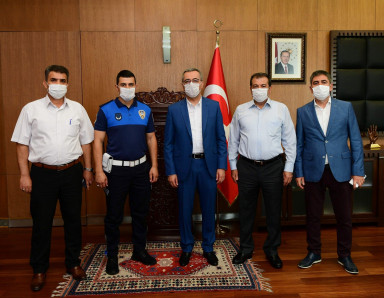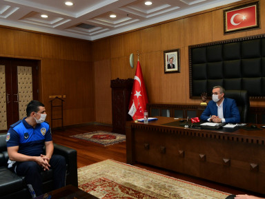 Kahramanmaraş Büyükşehir Belediye Başkanı Hayrettin Güngör, görev sırasında yanan aracı söndüren Zabıta Memuru Enes Doğan’ı makamında kabul ederek altınla ödüllendirdi.