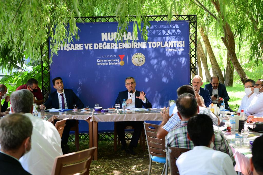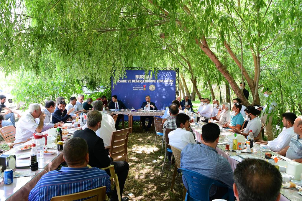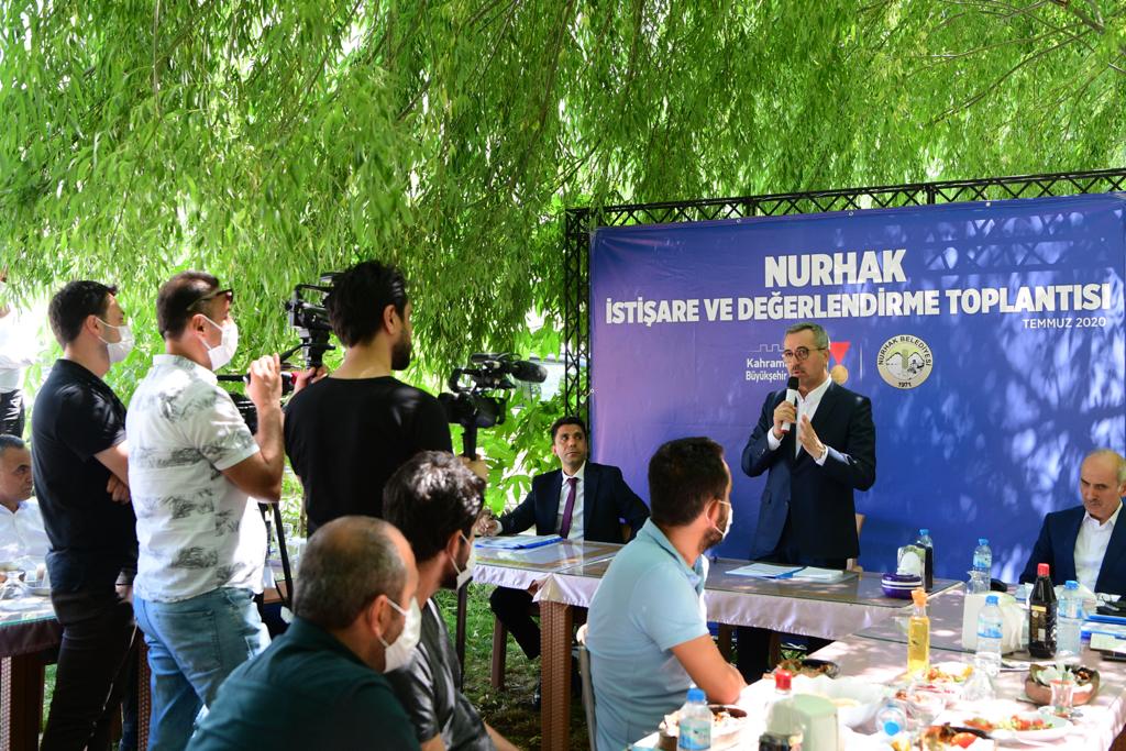 KMBB olarak hedef ve önceliklerini belirten Başkan Güngör;“İstişare ve Değerlendirme Toplantılarımızın dokuzuncusunu yapmak üzere Nurhak’tayız. Yaptığımız yatırım ve çalışmaları yerinde incelemek; sorun, beklenti, sıkıntı ve talepleri birinci ağızdan dinlemek amacıyla bu toplantıları düzenliyoruz. Nurhak ilçemize baktığımız, diğer ilçelerimizde olduğu gibi en başta arıtma ve kanalizasyon sorununun olduğunu görüyoruz. Bunun için KASKİ Genel Müdürlüğümüz, ciddi bir program ve proje hazırladı ve bunları öncelik sırasını gözeterek eyleme geçirdi. Şunu belirtmeliyim: Biz Büyükşehir olarak, özellikle kırsal alanlarımızda su ve yol çalışmalarına öncelik veriyoruz. Hemen bütün ilçelerimizde yol, su, kanalizasyon, toplu ulaşım ve sosyal mekanihtiyaçları ön plana çıkıyor. Bu yılki hedefimiz, yol ve su sorununu tamamen ortadan kaldırmaktır. İkinci bir husus olarak, bir yerleşim yerinin gelişiminin ve orada yapılacak her çalışmanın başlangıcı imar planından geçmektedir, bunu belirtmeliyim. Nurhak ilçemizin de imar planı çalışmalarına başladık. Büyükşehir ve ilçe belediyemizin işbirliği ve koordinasyonuyla bu çalışmalar devam ediyor. İmar planı birçok şeyin altyapısını oluşturuyor. Okul, sanayi tesisi, yeşil alan, sağlık tesisi, yol… neredeyapılacak, nerede yapılırsa daha iyi olur, tüm bunları bilmek, imar planıyla mümkündür. İnşallah bu çalışmayı kısa süre içinde bitirmiş olacağız.”