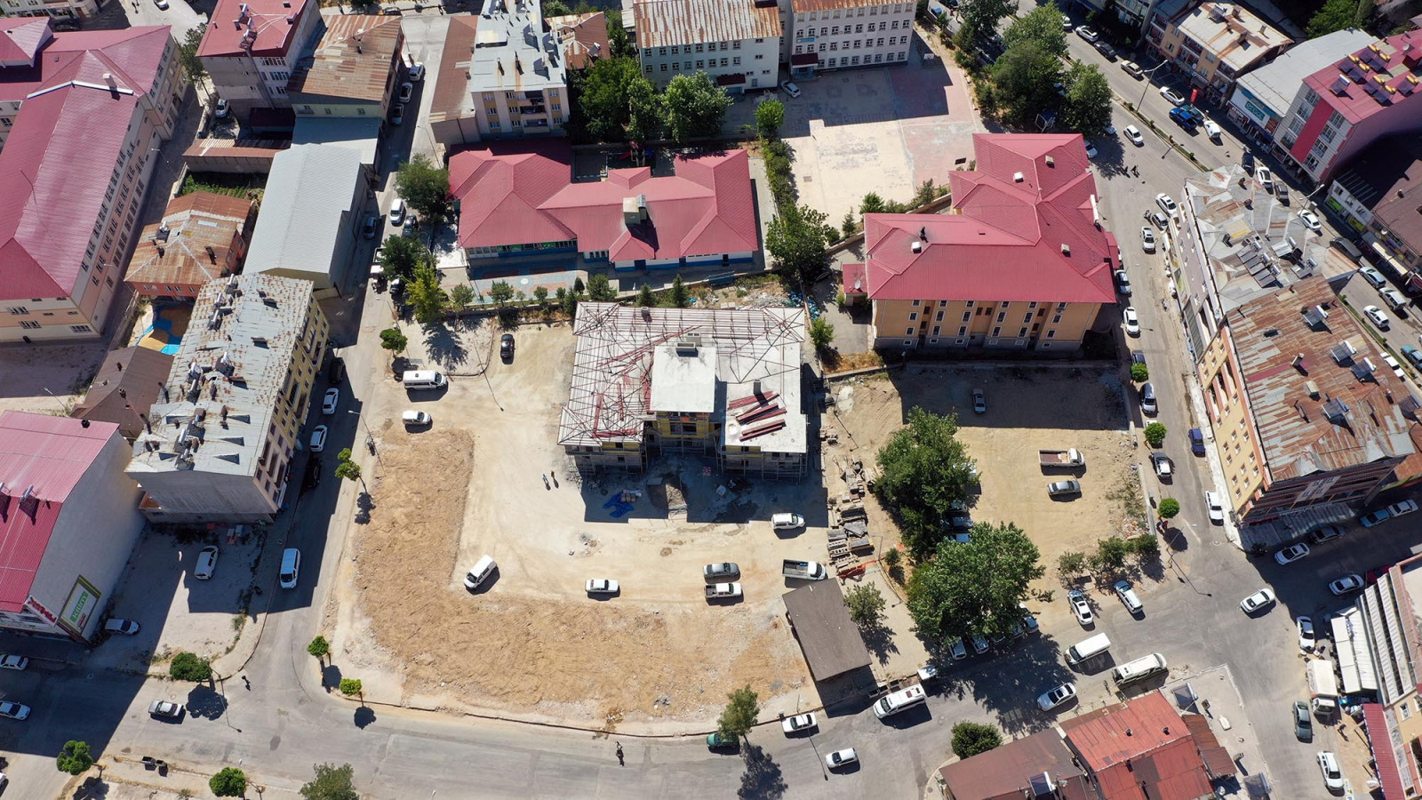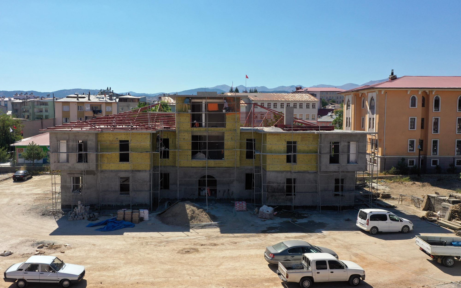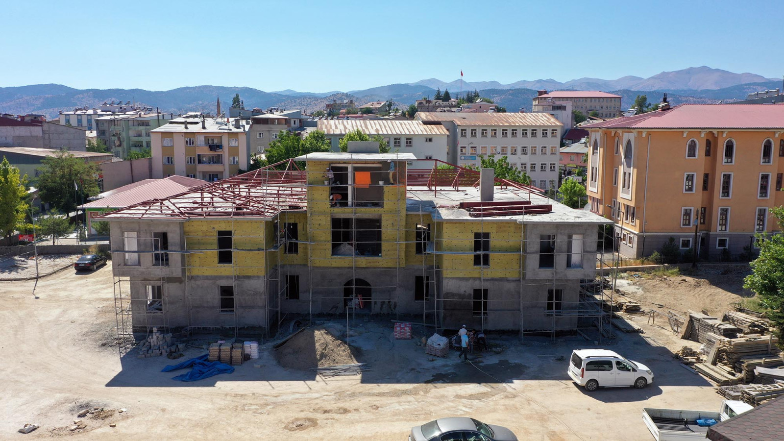 KMBB Fen İşleri Dairesi Başkanlığı ekipleri tarafından yürütülen Göksun Millet Konağı ve Bahçesi çalışmalarında binanın inşaat kısmı tamamlanarak izolasyon ve çatı kaplamaya geçildi.