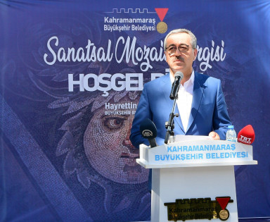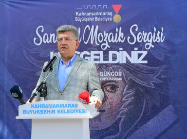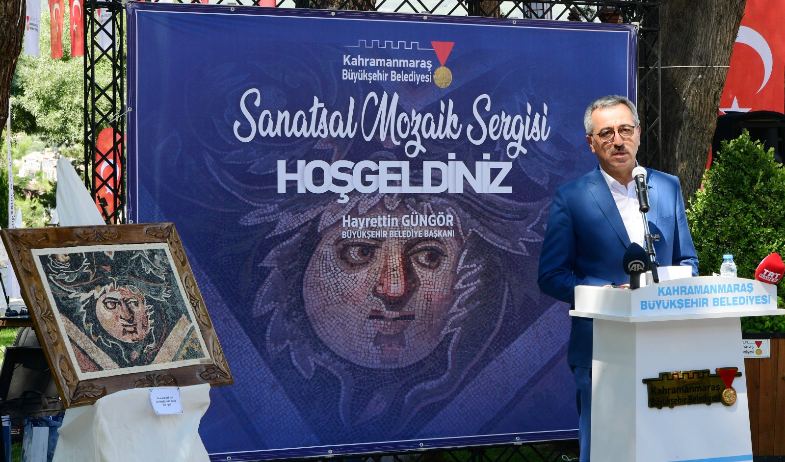 Sergi açılışında Kahramanmaraş’ın 10 bin yıl geriye götürülebilecek bir tarihe sahip olduğunu belirten Kahramanmaraş Büyükşehir Belediye Başkanı Hayrettin Güngör; “Her zaman söylediğimiz gibi, Kahramanmaraş’ımız kadim bir tarihe sahiptir. Bunun anlam ve önemini şehrimizde bugün de yaşatılmakta olan el sanatları ve sanatın diğer dallarına bakarak anlayabiliriz. Maraş Saray Mutfağı, Kahramanmaraş’ımızın kadim kültürünü yansıtan bir yönüdür. Bıçakçılık, kuyumculuk, bakırcılık, Maraş işi sim sırma ve edebiyat, Kahramanmaraş kültürünün ne kadar kalıcı, etkileyici ve özel olduğunu göstermeye yetmektedir. Bir resim sanatı olarak değerlendirilen mozaik sanatı da Kahramanmaraş’ımızın bu sanatsal yönünü yansıtan diğer bir yönüdür. Şimdi bunların yaşatılması, tanıtılması, şehrin turizmine, ekonomisine kazandırılması için gayret gösteriyoruz. Germanica Antik Kenti’nde, camilerimizde, tarihi konaklarımızda rastladığımız, taş ve cam kullanılarak icra edilen mozaik sanatı geçmişi bugüne, bugünü de geleceğe taşımaktadır. Büyükşehir Belediyesi olarak bu nadide, kalıcı sanat dalının, günümüzde daha aktif icra edilmesi için, üniversitemiz ve İŞ-KUR işbirliğiyle ev hanımlarımıza yönelik Sanatsal Mozaik Kursu açtık. Kursiyerlerimizin çoğu ev hanımlarından oluşmaktadır. Sergimiz, bu KAMEK kursunda eğitimini başarıyla tamamlayan kursiyerlerin değerli çalışmalarından oluşmaktadır. Hepsini yürekten tebrik ediyorum. Değerli hocalarıma teşekkür ediyorum. Bu tür çalışmaların şehrimizin tanıtımında, kültürel değerlerinin yansıtılmasında çok etkilidir.” ifadelerinde bulundu.