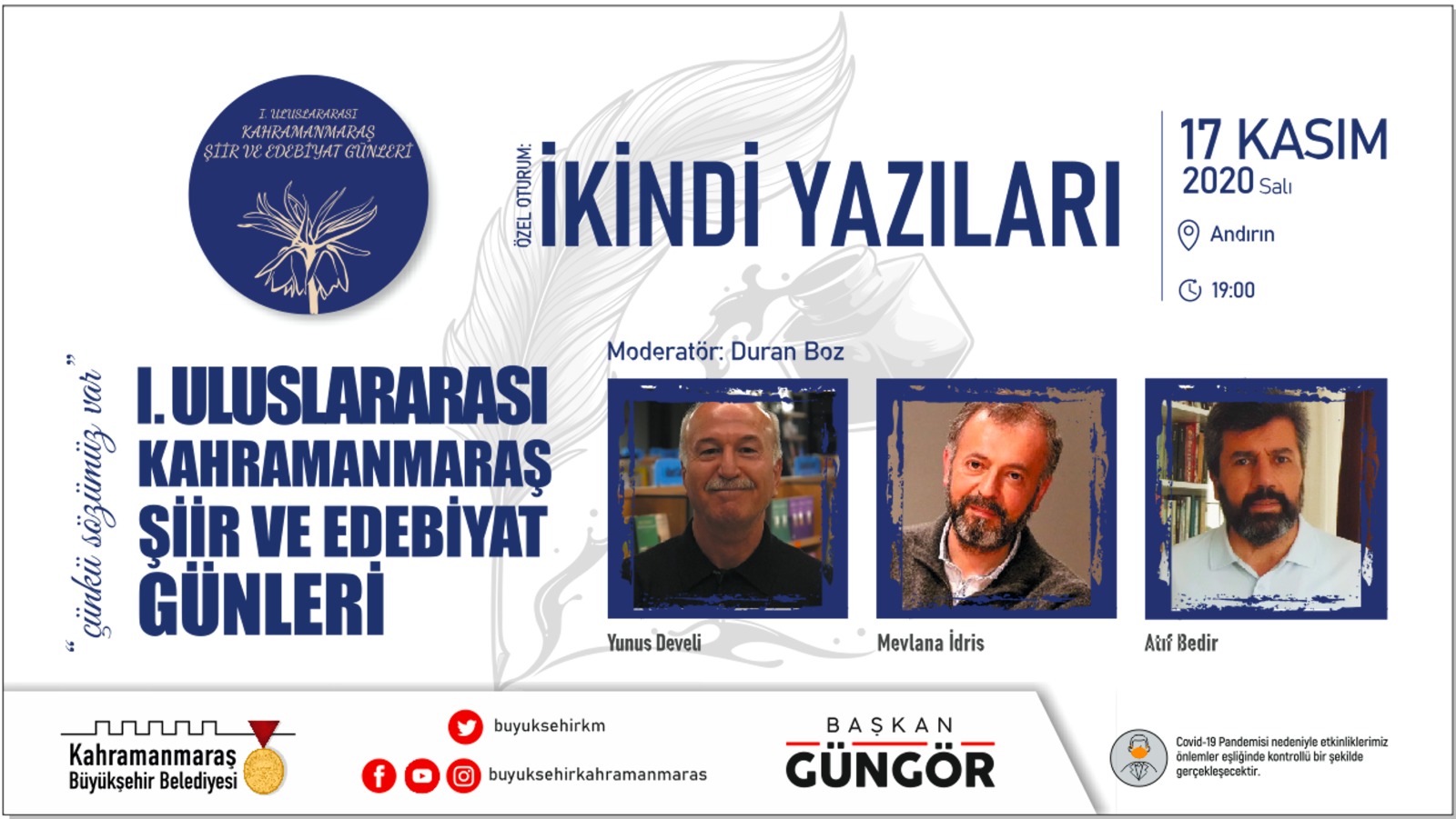 20 Kasım Cuma, 20.00’da gerçekleştirilecek etkinlikle ilgili olarak, “Erdem Bayazıt Şiir Ödülü, Nuri Pakdil Araştırma Ödülü, Rasim Özdenören Öykü Ödülü, Tahsin Yücel Roman Ödülü, Cahit Zarifoğlu Çocuk Edebiyatı Ödülü, Bahaettin Karakoç Dijital Edebiyat Kültür Platformu Ödülü, Abdurrahim Karakoç TV Edebiyat Programı Ödülü ve Yedi Güzel Adam Jüri Özel Ödülü sahiplerini bulacak.Mehmet Akif Ersoy Kültür Merkezi’nde, sunuculuğunu Bahadır Yenişehirlioğlu ile Mehmet Zeyd Yıldız’ın yapacağı etkinlikte sanatçı Yücel Arzen Kahramanmaraşlılarla buluşacak” ifadeleri kullanıldı. Programların pandemi tedbirleri kapsamında gerçekleştirileceğinin de belirtildiği açıklamada ayrıntılı bilgilerin https://www.kmedebiyatgunleri.com/ adresinden paylaşıldığı ifade edildi.