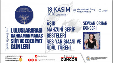 5 gün boyunca kesintisiz bir şekilde sürecek etkinliklerde Sevcan Orhan’ın katılımıyla Aşık Mahzuni Şerif Besteleri Ses Yarışması ödül töreninin de gerçekleştirileceğinin belirtildiği açıklamada, “18 Kasım Çarşamba günü 20.00’da, Mehmet Akif Kültür Merkezi’nde Aşık Mahzuni Şerif Besteleri Ses Yarışması Ödül Töreni’ni gerçekleştireceğiz. Bu programımızda sanatçı Sevcan Orhan bir konser de verecek” ifadeleri kullanıldı.