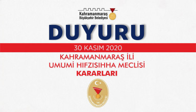 Kahramanmaraş İl Umumi Hıfzıssıhha Meclisi 30 Kasım 2020 günü saat 14.00’da Vali Ömer Faruk Coşkun Başkanlığında Valilik Toplantı Salonunda toplanarak aşağıdaki kararları almıştır. Korona virüs (Covid19) salgının toplum sağlığı ve kamu düzeni açısından oluşturduğu riski yönetmek, sosyal izolasyonu temin ile sosyal mesafeyi koruma ve yayılım hızını kontrol altında tutma amacıyla ilimizde alınan tedbirlere ek olarak ilave tedbirler alınmıştır.
