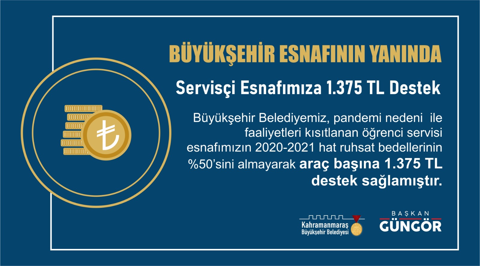 Kahramanmaraş Büyükşehir Belediyesi Mayıs ve Kasım Ayı Olağan Meclis Toplantıları’nda öğrenci servisi esnafına yönelik 2020 – 2021 hat ruhsatlarında %50 indirim yapılması kararı alınmıştı. Bu kapsamda Büyükşehir Belediye Başkanı Hayrettin Güngör, araç başına 1.375 TL’lik desteğin sağlandığını açıkladı.
