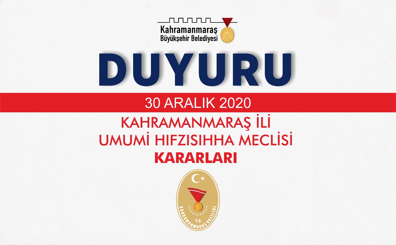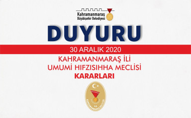 Kahramanmaraş İl Umumi Hıfzıssıhha Meclisi 30 Aralık 2020 günü saat 15:00’da Vali Ömer Faruk COŞKUN Başkanlığında Valilik Toplantı Salonunda toplanarak aşağıdaki kararları almıştır.