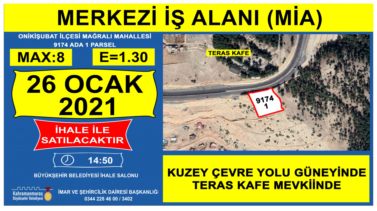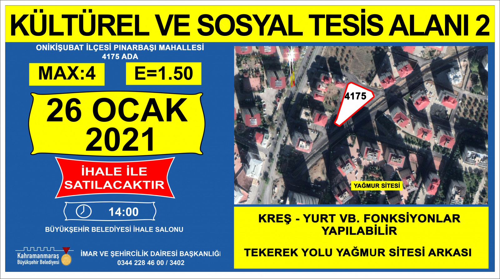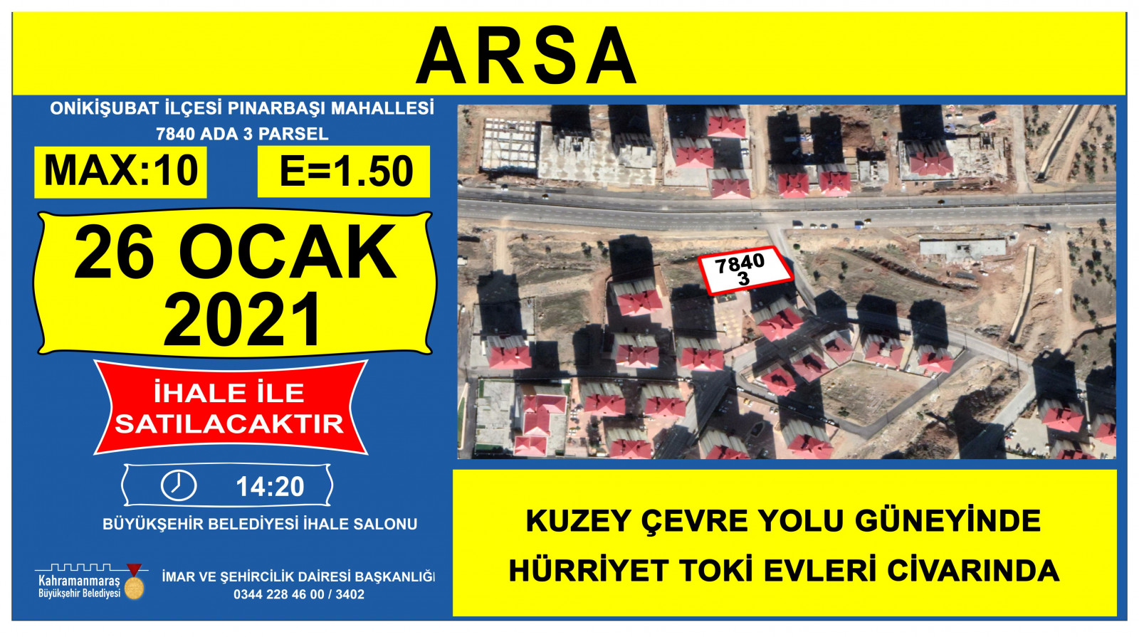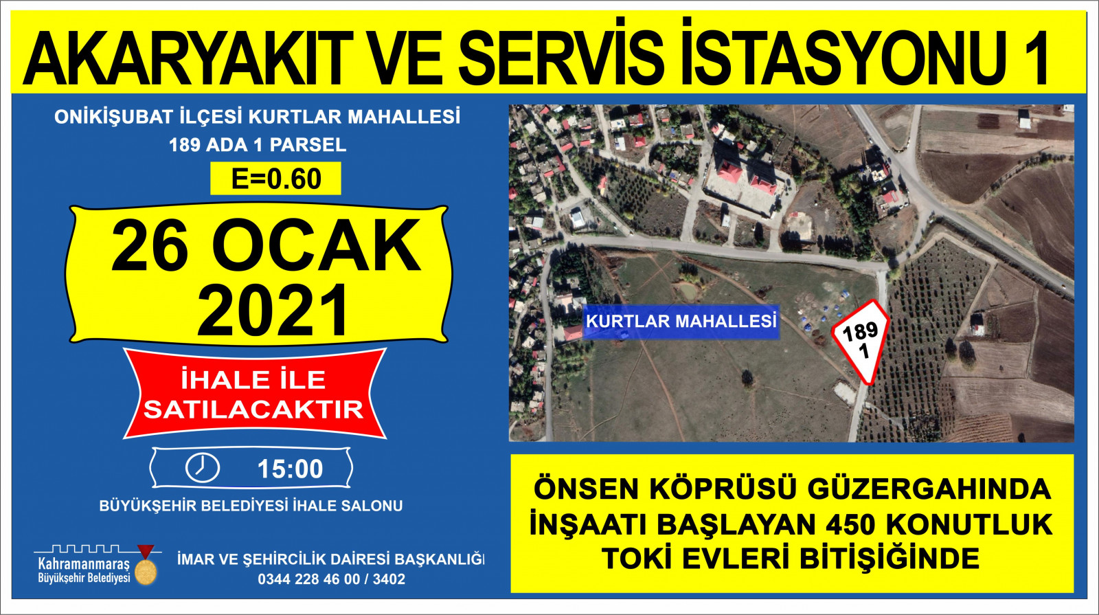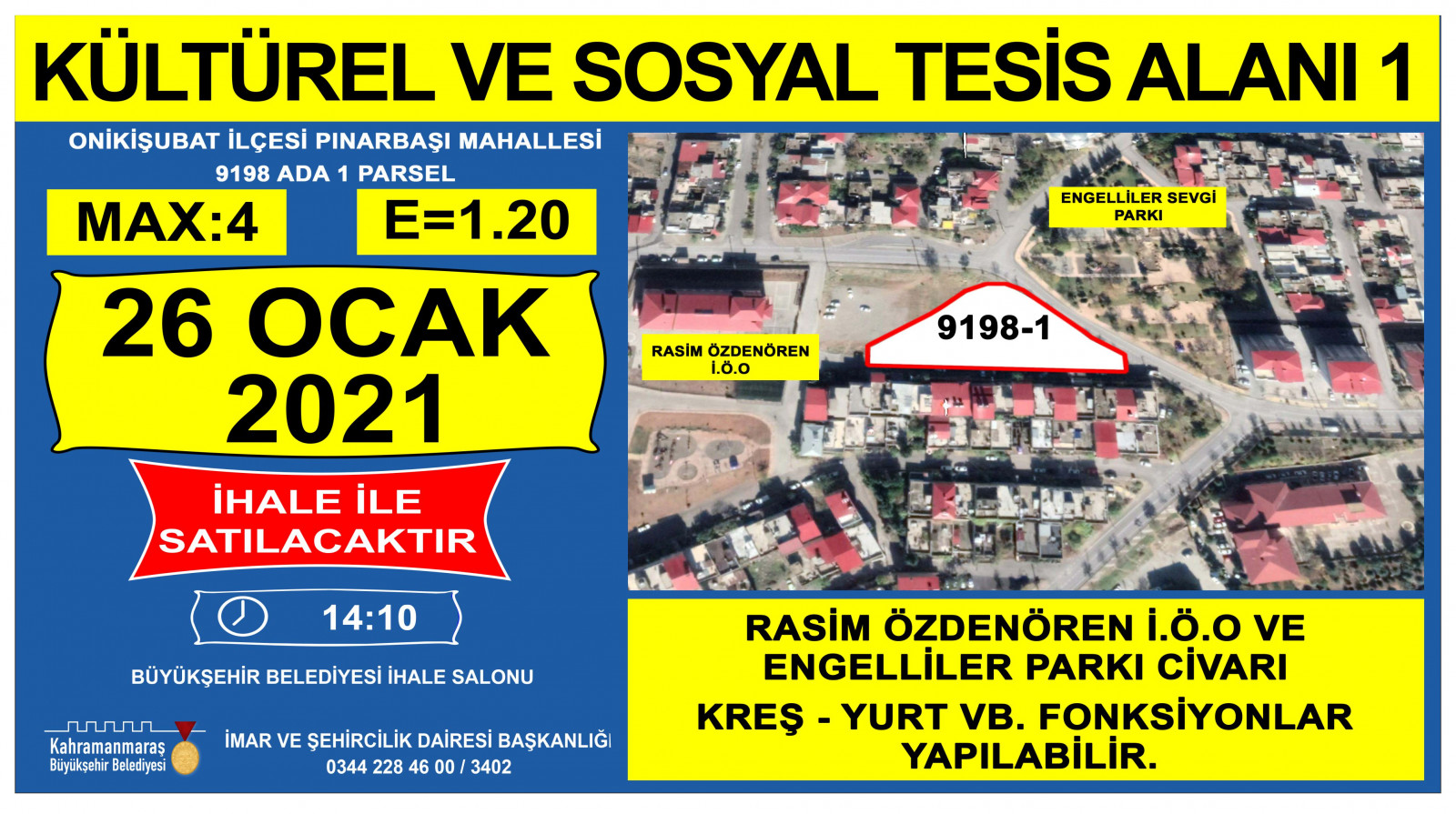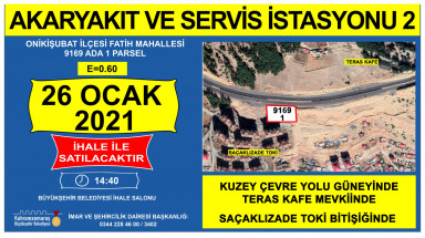 Kahramanmaraş Büyükşehir Belediyesi kendisine ait taşınmazların satışına ilişkin ihaleyi 26 Ocak 2021 tarihinde Encümen Salonu’nda gerçekleştirecek. İmar ve Şehircilik Dairesi Başkanlığı’ndan konu ile ilgili olarak yapılan açıklamada: “Mülkiyeti Kahramanmaraş Büyükşehir Belediyesine ait taşınmazların satış ihalesi 2886 sayılı Devlet ihale Kanunun ilgili maddeleri doğrultusunda belirtilen tarih ve saat’te, İsmetpaşa Mahallesi Azerbaycan Bulvarı No: 25 adresindeki Kahramanmaraş Büyükşehir Belediyesi Encümen salonunda yapılacaktır. İligililere ilanen duyurulur” denildi.