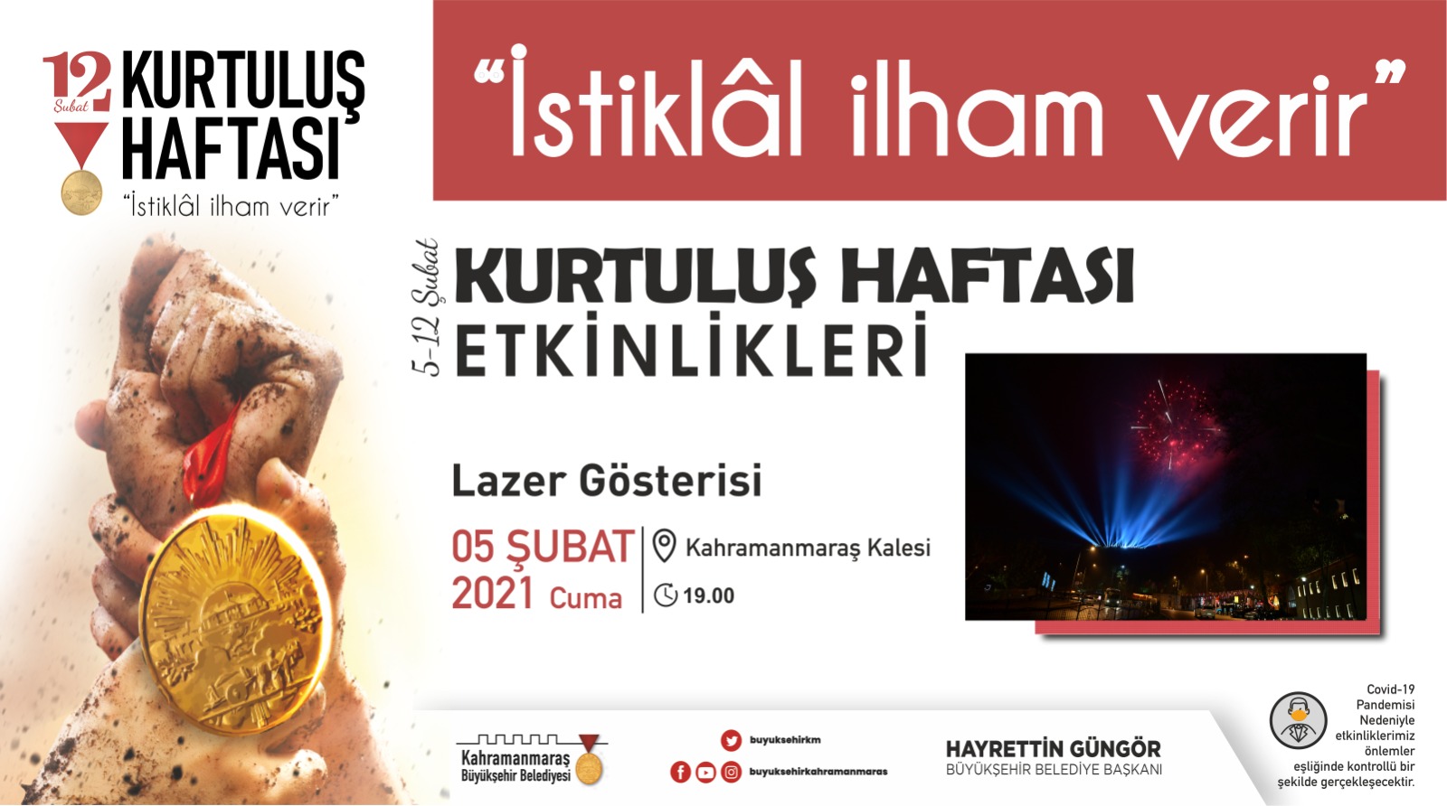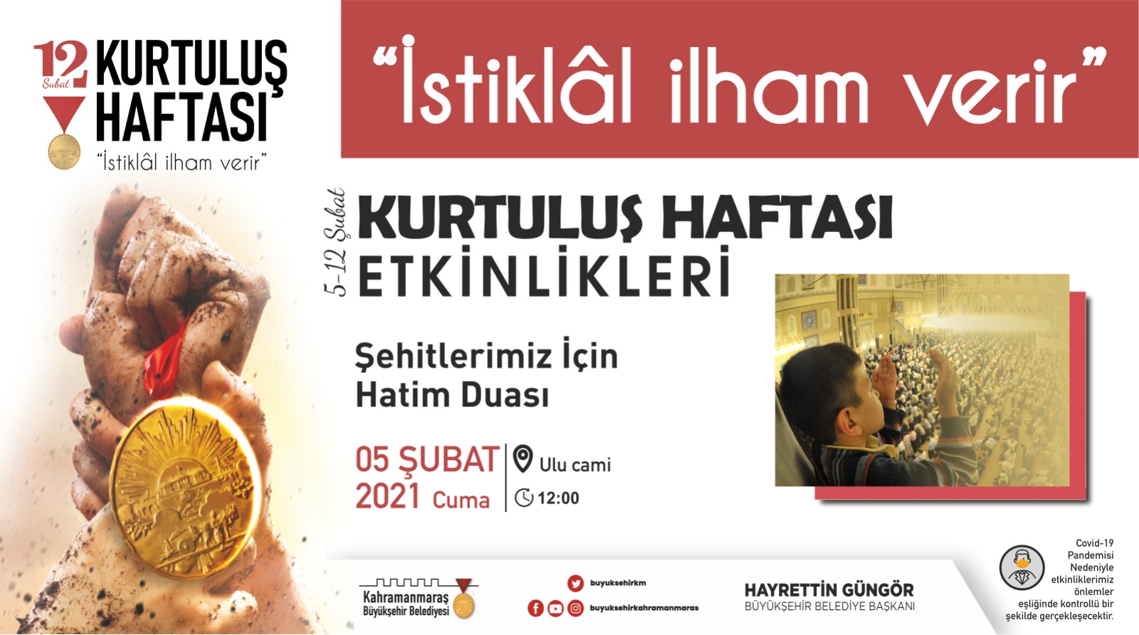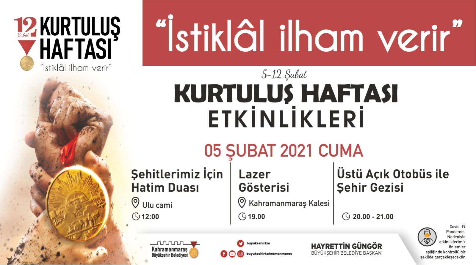 Kahramanmaraş Büyükşehir Belediyesi tarafından düzenlenen 12 Şubat Kurtuluş Haftası Etkinlikleri başlıyor. 5 – 12 Şubat tarihleri arasında gerçekleştirilecek etkinlikler, şehitlerimizin anılması için camilerde yapılacak hatim duası ile başlayacak. Büyükşehir Belediyesi’nin organizesi ile “İstiklal İlham Verir” teması ile düzenlenen etkinler, pandemi tedbirleri çerçevesinde gerçekleştirilecek. 5 Şubat Cuma günü (yarın) başlayacak etkinliklerin ilk günü şu şekilde: