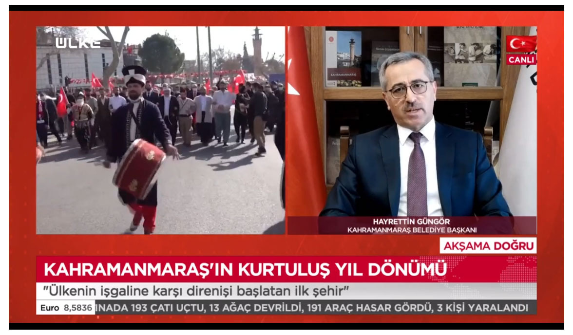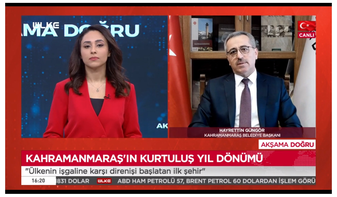 Kahramanmaraş Büyükşehir Belediye Başkanı Hayrettin Güngör, Ülke TV canlı yayınına katıldı. Ebru Kaçar’ın sunduğu Akşama Doğru programında milli mücadelenin 101. yıldönümü ile ilgili açıklamalarda bulunan Başkan Güngör, “101. yılını idrak ettiğimiz kurtuluşumuzu bu sene bütün dünyayı etkileyen pandemi sebebiyle, kısıtlılıklar çerçevesinde kutluyoruz. Bir hafta sürecek etkinliklerimizi dijital dünyaya taşıyarak vatandaşlarımızla buluşturuyoruz. Kurtuluş Haftamızı pandeminin bitmesiyle birlikte, hemşehrilerimizle birlikte geniş bir katılımla kutlayacağız” diye konuştu.