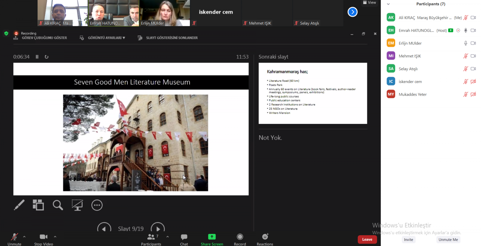 İlgili daire başkanlıklarından düzenlenen uluslararası toplantıya ilişkin yapılan açıklamada, “Kahramanmaraş Büyükşehir Belediyesi olarak UNESCO yolunda emin adımlarla ilerliyoruz. Bu süreçte başvuru sonrası süreçlerle ilgili mevcut Yaratıcı Şehirler Ağı üye kentleriyle ve UNESCO yetkilileriyle uluslararası temaslarımızı sürdürüyoruz. Hollanda’nın Utrecht şehri yetkilileriyle de bu kapsamda çevrimiçi ortamda toplantı düzenledik. Başvurumuzun olumlu sonuçlanması adına atılabilecek adımlarla ilgili görüş alışverişinde bulunduk. Gerek devam eden uluslararası temaslarımız gerekse yerelde yürüttüğümüz çalışmalarımızla şehrimizin edebiyat birikimini, evrenselleştirmeyi hedefliyoruz” ifadeleri kullanıldı.