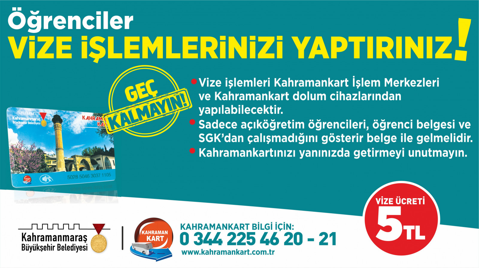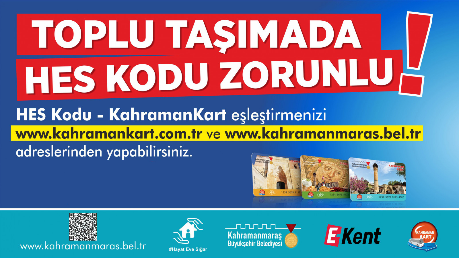 Kahramanmaraş Büyükşehir Belediyesi, toplu taşıma araçlarında kullanılan Kahramankart’lara “HES Kodu” eşleştirmesinin internetten, öğrenci vize işlemlerinin ise şehir genelinde bulunan 18 kiosktan yapılabileceği duyurusunda bulundu.