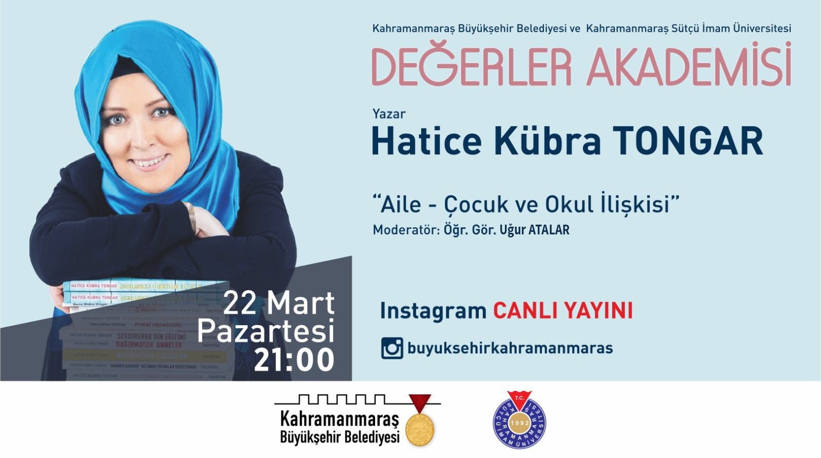 Kahramanmaraş Büyükşehir Belediyesi ve Kahramanmaraş Sütçü İmam Üniversitesi iş birliği ile gerçekleştirilen Değerler Akademisi etkinlikleri, 22 Mart Pazartesi günü (yarın) Yazar Hatice Kübra Tongar’ın konuk olacağı programla devam edecek. Saat 21.00’da, Büyükşehir Belediyesi Instagram hesabından canlı yayınlanacak programda Yazar Hatice Kübra Tongar, ‘Aile – Çocuk ve Okul İlişkisi’ üzerine konuşacak. İstiklal Üniversitesi Öğr. Gör. Uğur Atalar moderatörlüğünde gerçekleştirilecek programda, ailenin çocukla kuracağı diyaloğun önemi, iletişimin okuldaki başarıya etkileri gibi pek çok konu masaya yatırılacak.
