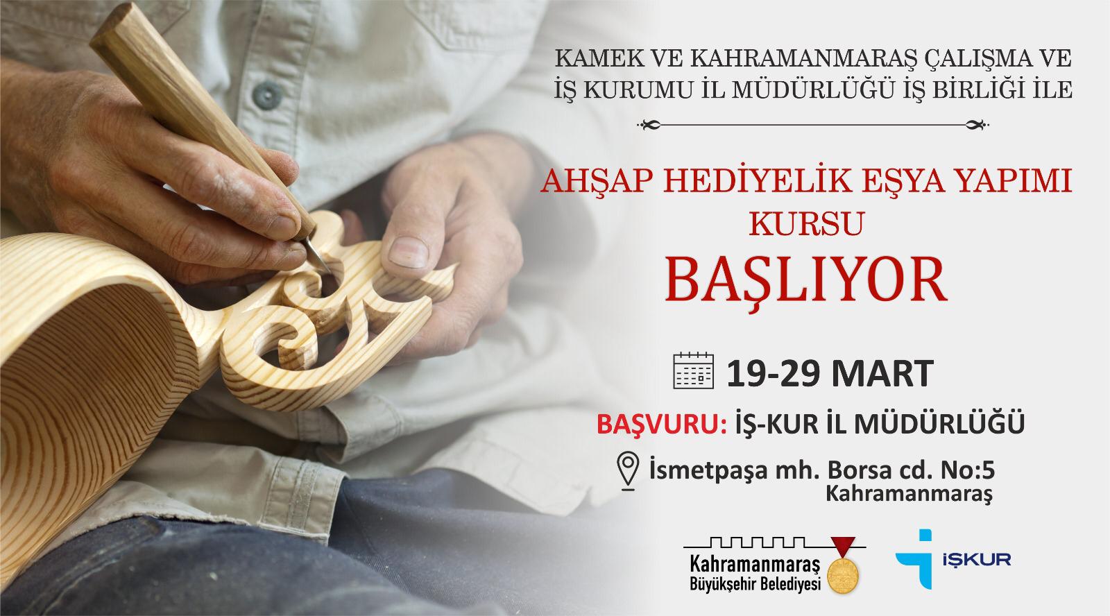 Kahramanmaraş Büyükşehir Belediyesi katkılarıyla düzenlenen Ahşap Hediyelik Eşya Yapımı kurs başvuruları 29 Mart tarihine kadar İşkur İl Müdürlüğü’nden yapılıyor.