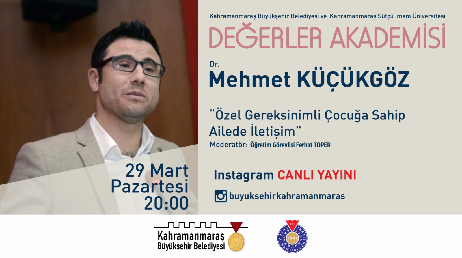 Kahramanmaraş Büyükşehir Belediyesi ve Kahramanmaraş Sütçü İmam Üniversitesi işbirliği ile gerçekleştirilen Değerler Akademisi, 29 Mart Pazartesi günü Dr. Mehmet Küçükgöz’ün konuk olacağı programla devam edecek. Saat 20.00’da Büyükşehir Belediyesi Instagram hesabından canlı yayınlanacak programda, ‘Özel Gereksinimli Çocuğa Sahip Ailede İletişim’ üzerine konuşulacak. Öğr. Gör. Ferhat Toper moderatörlüğünde gerçekleştirilecek programda, özel gereksinimli çocuklarla ideal iletişim ve yaklaşım biçimleri, çocukların sosyal hayatta etkinliği ve aile bağlarının güçlendirilmesi gibi pek çok konu masaya yatırılacak.