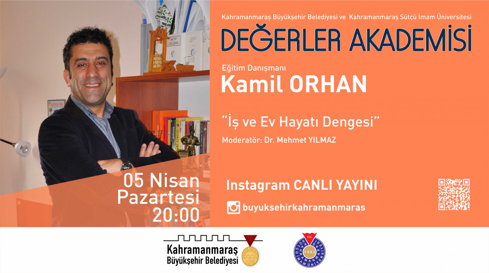 Kahramanmaraş Büyükşehir Belediyesi ve Kahramanmaraş Sütçü İmam Üniversitesi işbirliği ile gerçekleştirilen Değerler Akademisi, 5 Nisan Pazartesi (bugün) Prof. Dr. Kamil Orhan’ın konuk olacağı programla devam edecek. Saat 20.00’da Büyükşehir Belediyesi Instagram hesabından canlı yayınlanacak programda, ‘İş ve Ev Hayatı Dengesi’ üzerine konuşulacak. Dr. Mehmet Yılmaz moderatörlüğünde gerçekleştirilecek programda, yoğun iş hayatının aile yaşamına etkisi, aile ve iş dengesi ve iş hayatındaki yaşanan olumsuzlukların aileye yansıtılmaması gibi pek çok konu masaya yatırılacak.