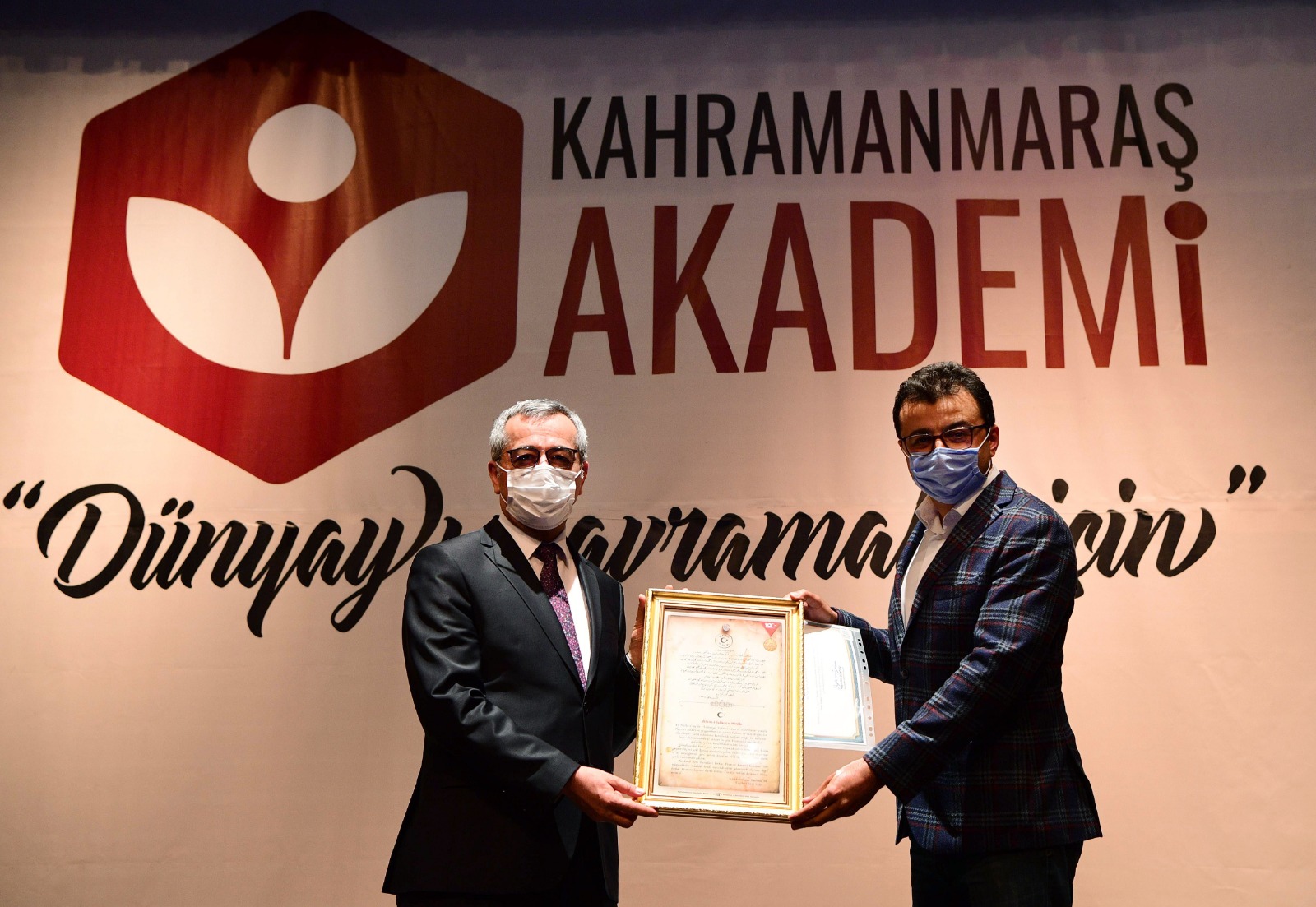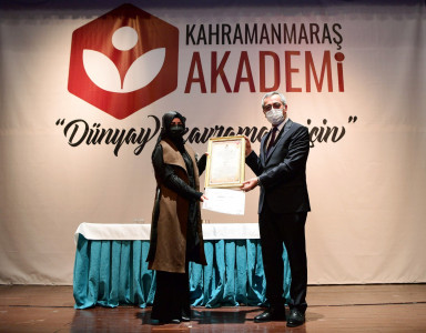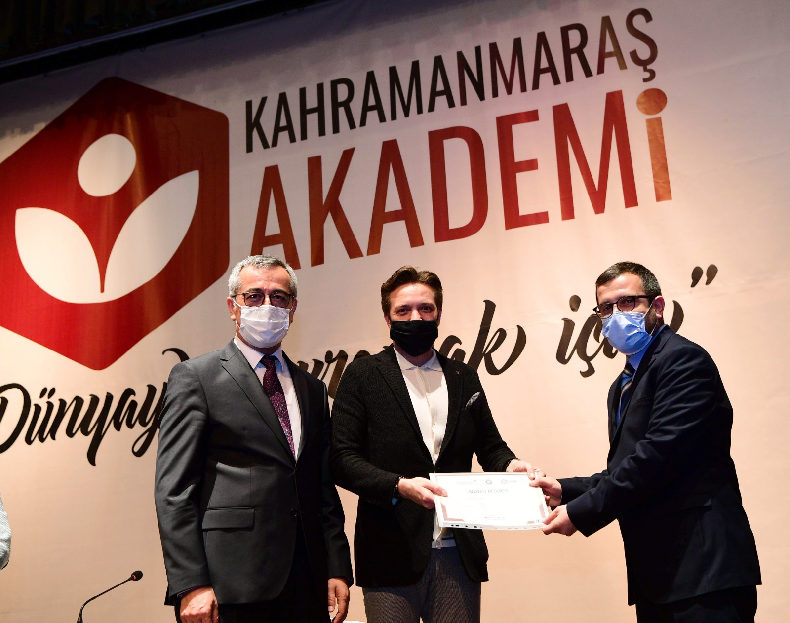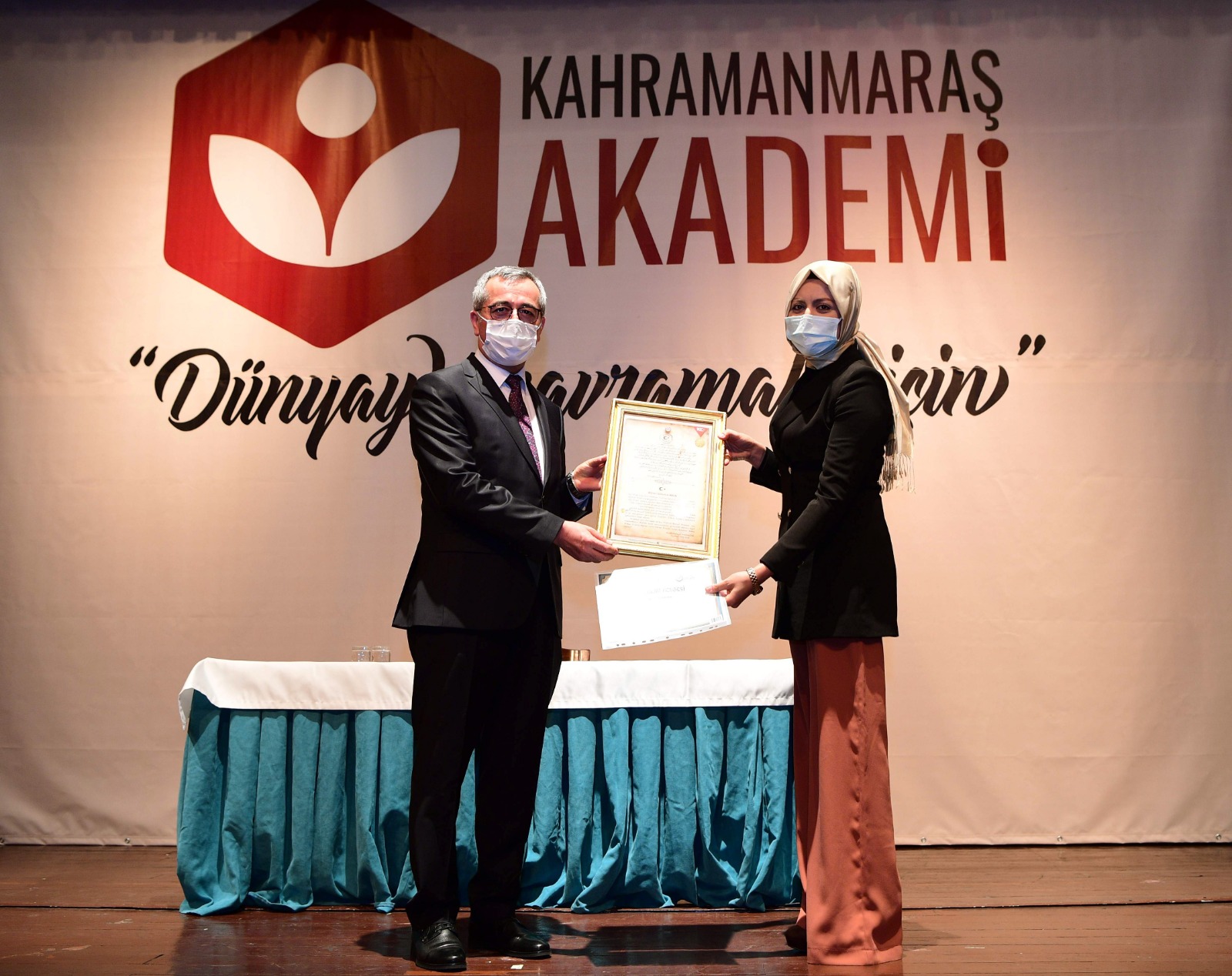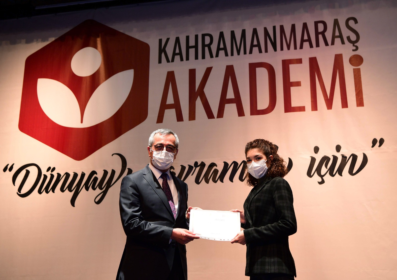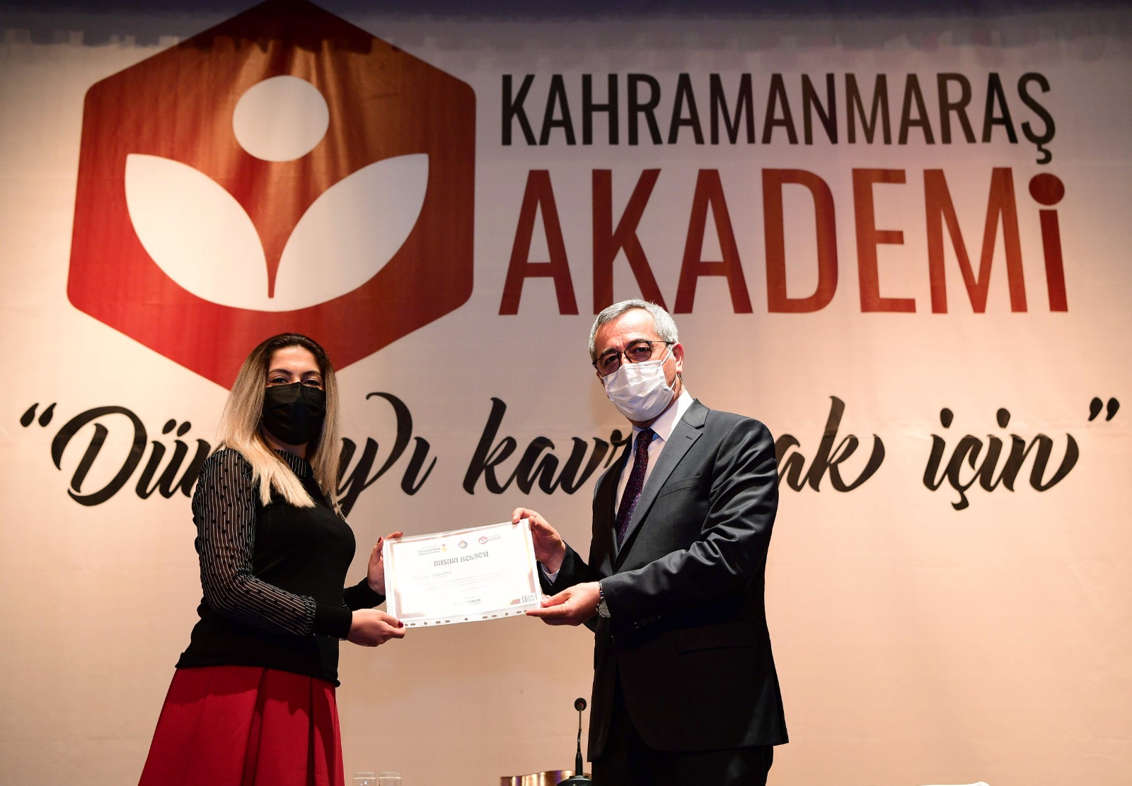 Büyükşehir Belediye Başkanı Hayrettin Güngör sözlerini, “Sütçü İmam Üniversite’mizle ve diğer tüm paydaş kurumlarımızla kurduğumuz yüksek koordinasyon, bir kültür ve sanat iklimi oluşturmamıza olanak sağlıyor. Kahramanmaraş Akademi de şehrin kültürel birikimini artırıcı bir rolü hamdolsun üstlendi. Akademi eğitimlerimizin yaz döneminde ve önümüzdeki diğer eğitim öğretim dönemlerinde devam edeceğinin müjdesini de vermiş olalım. Bu vesileyle tüm eğitimcilerimize canı gönülden teşekkür ediyor, kursiyerlerimizi başarılarından dolayı tebrik ediyor ve gelecek Ramazan ayının hayırlara vesile olmasını diliyorum” ifadeleriyle noktaladı. Sertifika töreniyle devam eden etkinlikte kursiyerlere ve eğitmenlere sertifikaları Başkan Güngör tarafından verildi.