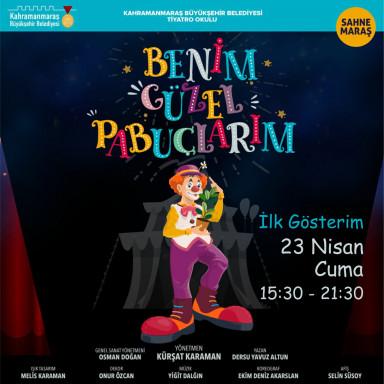 Kahramanmaraş Büyükşehir Belediyesi Sahne Maraş Tiyatro Akademisi meyvelerini vermeye başlıyor. Eğitim alan oyuncular tarafından hazırlanan “Benim Güzel Pabuçlarım” adlı çocuk oyunu 23 Nisan Ulusal Egemenlik ve Çocuk Bayramı’nda seyirciyle buluşuyor. Dersu Yavuz Altun'un yazdığı, Kürşat Karaman'ın yönettiği, Osman Doğan'ın genel sanat yönetmenliğini yaptığı tiyatro oyunu 23 Nisan Cuma günü Büyükşehir Belediyesi sosyal medya hesaplarından ve Aksu TV’den canlı olarak yayınlanacak. Oyunun ilk gösterimi 15.30’da, ikinci gösterimi ise saat 21.30’da başlayacak.