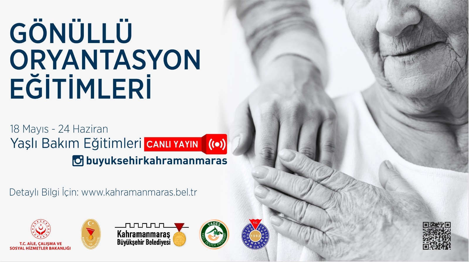 Kahramanmaraş Büyükşehir Belediyesi’nin katkılarıyla ücretsiz olarak düzenlenecek Yaşlı Bakım Eğitimleri başlıyor. Uzmanların sunumuyla gerçekleştirilecek eğitimler 18 Mayıs ve 24 Haziran arasında Büyükşehir Instagram hesabından canlı yayınlanacak.