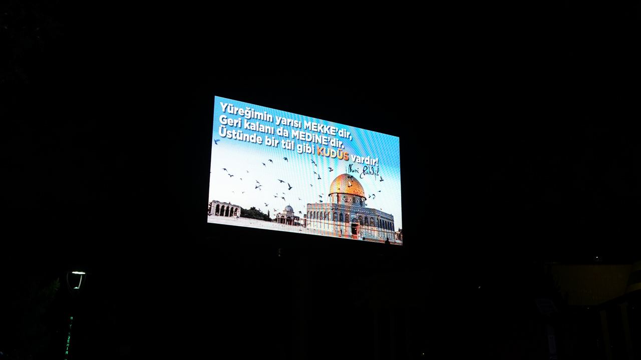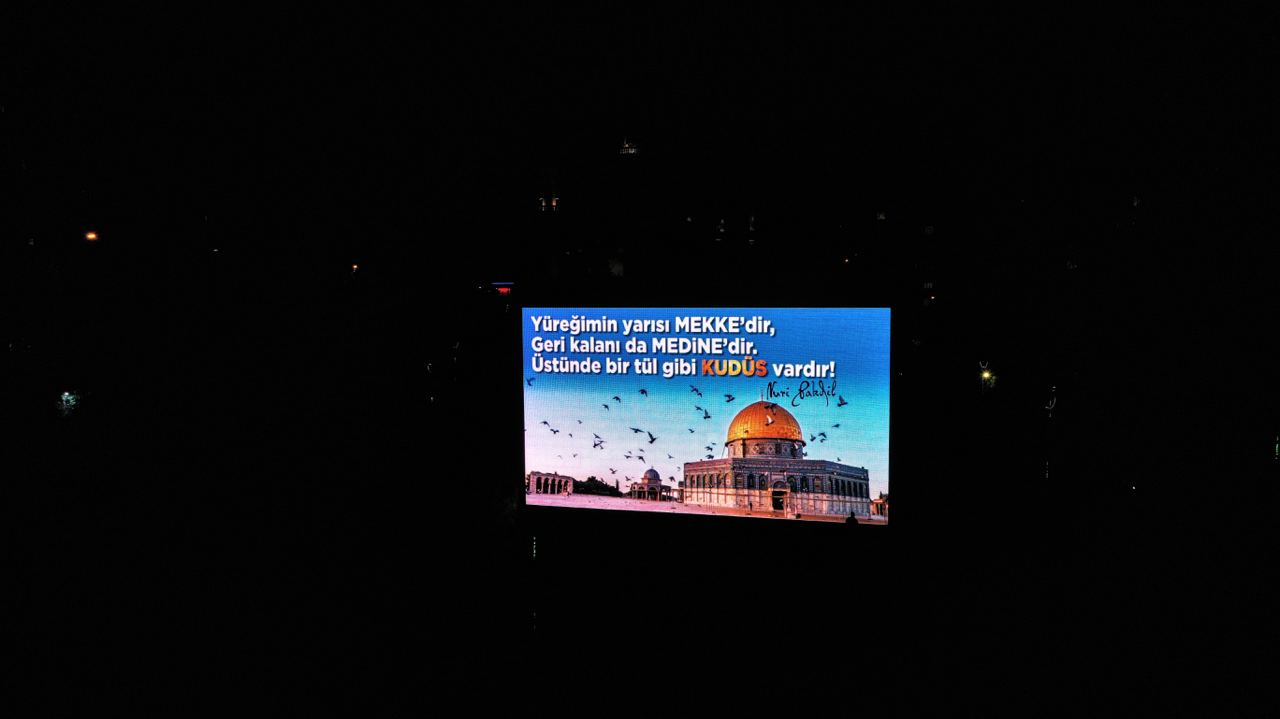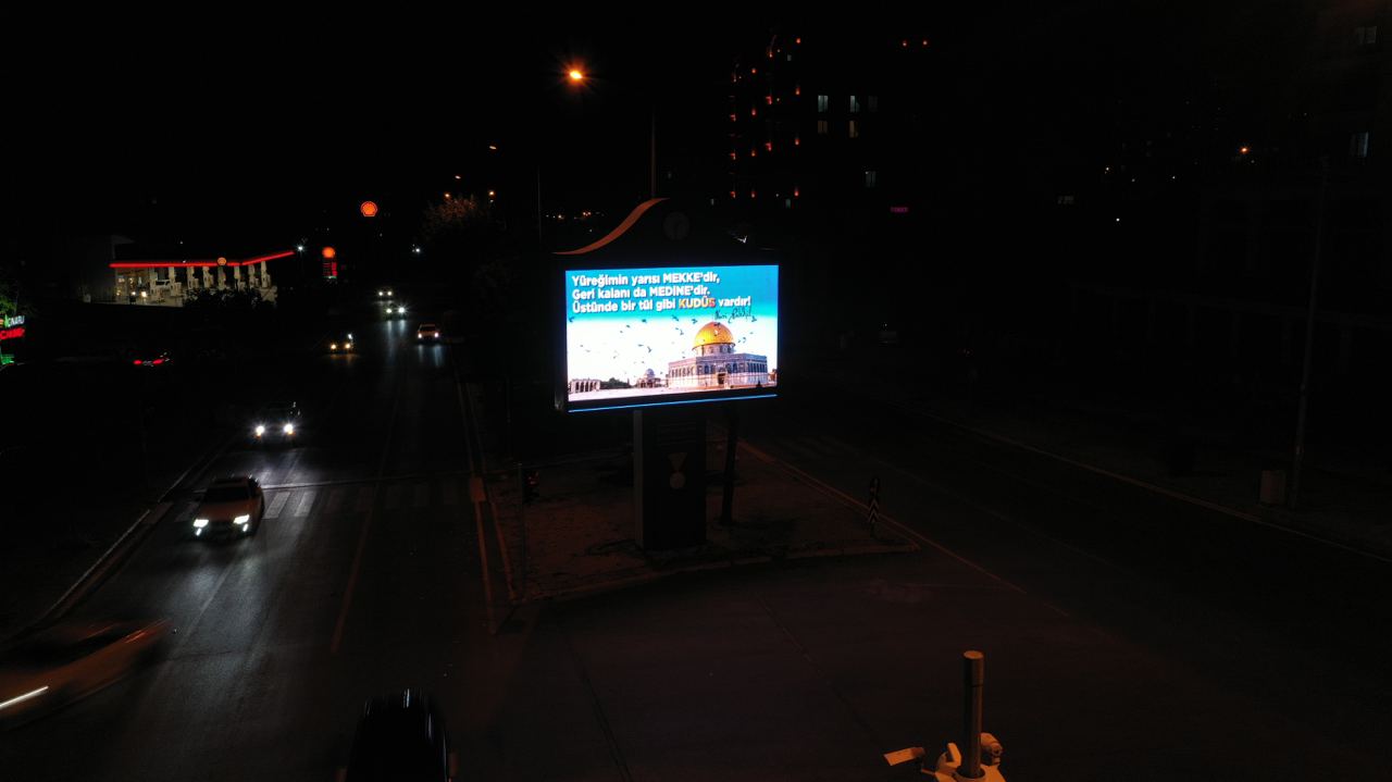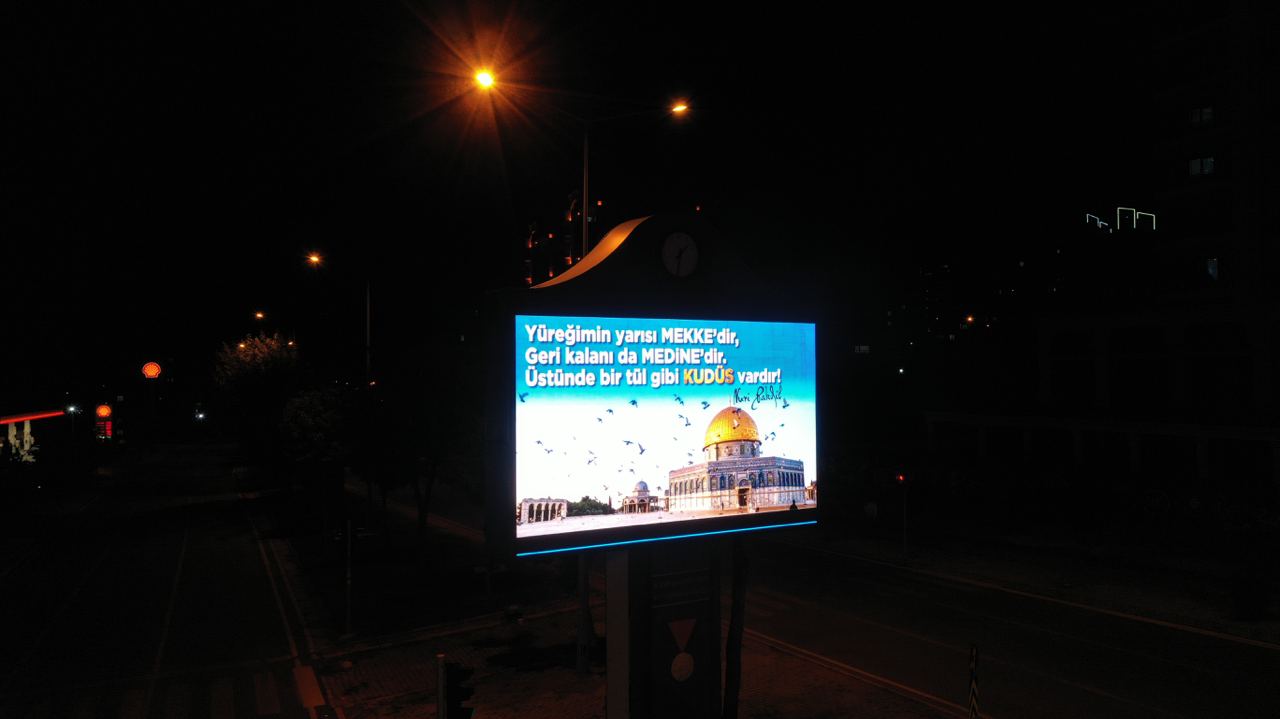Mescid-i Aksa’da günlerdir devam eden saldırılara karşı şehirdeki led ekranların tümünden Filistin’e destek mesajı yayınlandı. Başkan Güngör yaptığı açıklamada, “İsrail polisinin ses bombalı saldırılarını şiddetle kınıyorum” ifadelerini kullandı.