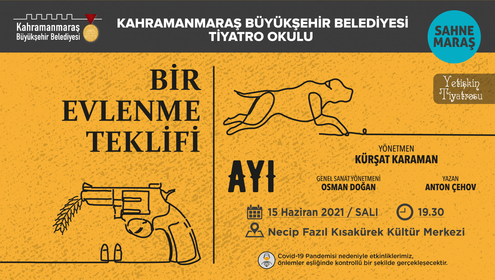 Kahramanmaraş Büyükşehir Belediyesi tarafından gerçekleştirilen Sahne Maraş tiyatro okulu meyvelerini vermeye başlıyor. Oyuncu adayları tarafından uzun süredir provaları yapılan 4 yeni oyun Haziran ayı içinde seyirci karşısına çıkacak. Yetişkin ve çocuk oyunlarının da yer aldığı tiyatro takviminde, ilk gösterim gülmece türündeki “Bir Evlenme Teklifi - Ayı” oyunuyla ücretsiz olarak sahnelenecek. Toplumcu gerçekçi Rus yazar Çehov tarafından kaleme alınan oyun, insanın kendine has yapısını gülünç bir dille anlatıyor. 15 Haziran Salı günü (yarın) 19.30’da Necip Fazıl Kültür Merkezi’nde gerçekleştirilecek tiyatro oyunu, Sahne Maraş’ın genç yetenekleri tarafından kültür sanat dostlarının beğenisine sunulacak.