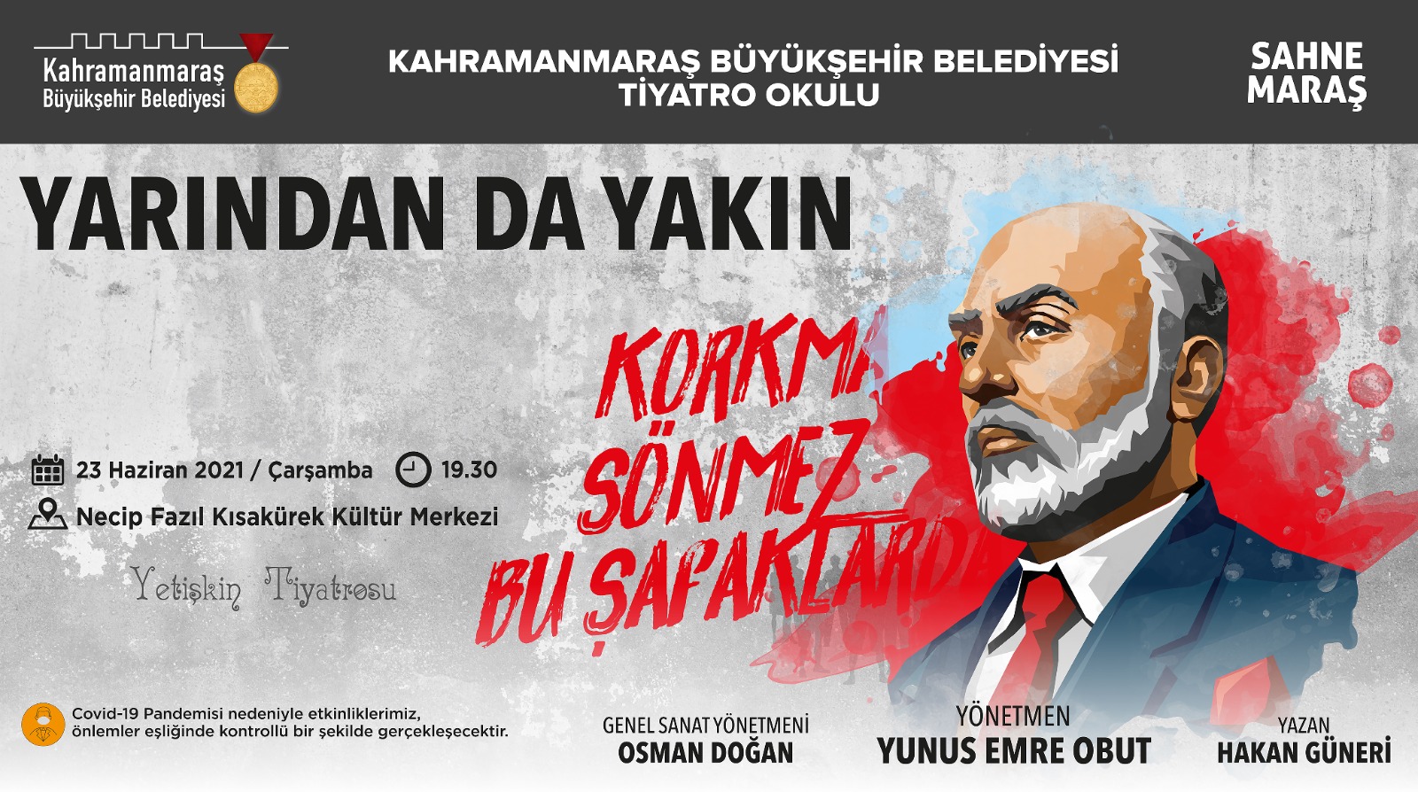Kahramanmaraş Büyükşehir Belediyesi tarafından düzenlenen “Sahne Maraş” tiyatro okulu öğrencileri bir oyunla daha seyirciyle buluşacak. Oyuncu adaylarının hazırlıklarını tamamladığı “Yarından da Yakın” adlı yeni oyun yetişkin yaş grubuna yönelik sahnelenecek. Yönetmenliğini Yunus Emre Obut’un üstlendiği tiyatro oyunu Mehmet Akif Ersoy’u birçok farklı yönüyle anlatacak. 23 Haziran Çarşamba günü 19.30’da gösterimi yapılacak oyunun biletleriyse Necip Fazıl Kısakürek Kültür Merkezi’nden ücretsiz olarak temin edilebiliyor.