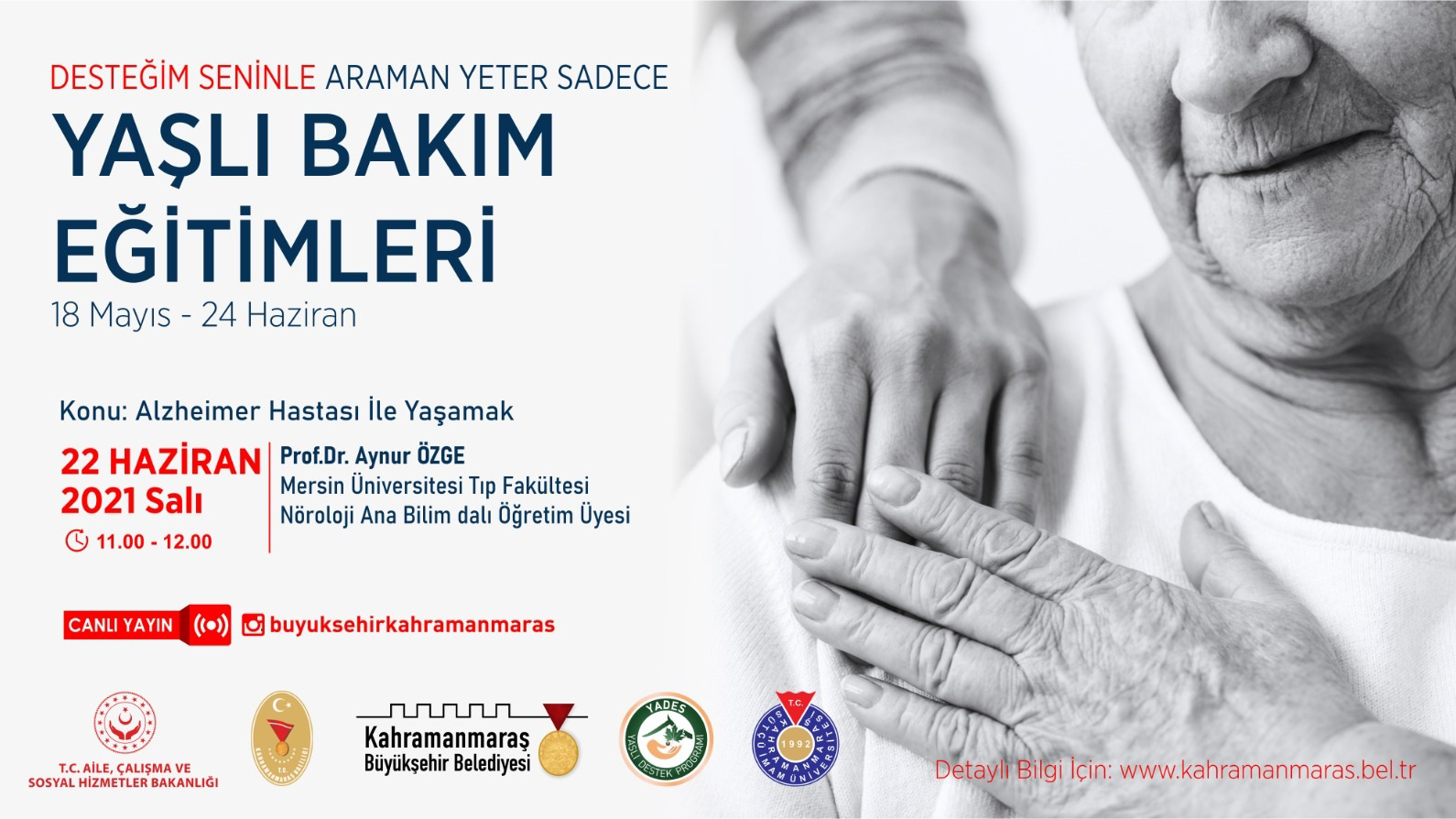 Kahramanmaraş Büyükşehir Belediyesi’nin katkılarıyla düzenlenen ‘Yaşlı Bakım Eğitimleri’ seminerleri devam ediyor. Aile Çalışma ve Sosyal Hizmetler İl Müdürlüğü, Kahramanmaraş Valiliği ve Sütçü İmam Üniversitesi işbirliğiyle düzenlenen seminerin konuğu Mersin Üniversitesi Tıp Fakültesi Nöroloji Ana Bilim Dalı Öğretim Üyesi Prof. Dr. Aynur Özge olacak. 22 Haziran Salı günü (yarın) 11.00 – 12.00 saatleri arasında gerçekleştirilecek olan program Büyükşehir Belediyesi’nin Instagram hesabından canlı yayınlanacak. Gerçekleştirilecek programda Alzheimer kavramı, hastalığın bireyin hayatına etkisi ve Alzheimer hastası ile yaşamak gibi pek çok konuya değinilecek.