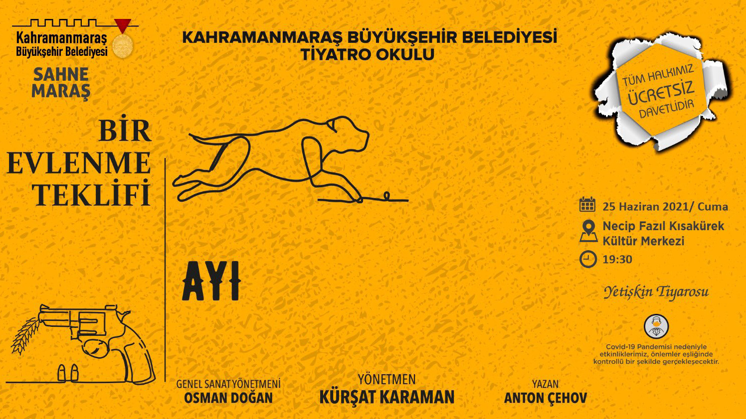 Kahramanmaraş Büyükşehir Belediyesi tarafından düzenlenen “Sahne Maraş” tiyatro okulu öğrencileri bir oyunla daha seyirci karşısına çıkacak. Oyuncu adayları, hazırlıklarını tamamladığı “Bir Evlenme Teklifi – Ayı” adlı gülmece türündeki oyununu sahneleyecek. Toplumcu gerçekçi Rus yazar Çehov tarafından kaleme alınan oyun, insanın kendine has yapısını gülünç bir dille anlatıyor. 25 Haziran Cuma günü (yarın) 19.30’da Necip Fazıl Kültür Merkezi’nde seyirciyle buluşacak olan oyunun biletleri de aynı merkezden ücretsiz olarak temin edilebiliyor.