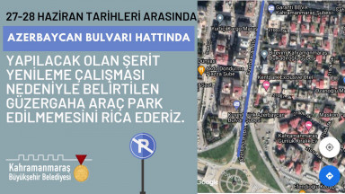 Kahramanmaraş Büyükşehir Belediyesi, şehir içi trafik akışını düzenleyen şeritleri yeniliyor. Ulaşım Hizmetleri Dairesi Başkanlığı koordinesindeki ekipler tarafından 27 Haziran Pazar (bugün) ila 28 Haziran Pazartesi (yarın) tarihleri arasında şerit – çizgi uygulaması gerçekleştirilecek. Azerbaycan Bulvarı hattında yapılacak çalışma yaklaşık 3 kilometrelik güzergâhta sürecek. Gece 22.00'dan başlayarak 06.00 saatleri arasına değin devam edecek uygulamalarla, arterdeki silik şeritler yenilenecek. Arterin gidiş ve geliş istikameti olmak üzere iki yönünde de yapılacak çalışmalara ilişkin Ulaşım Hizmetleri Dairesi Başkanlığı'ndan yapılan açıklamada, "Pazar ve Pazartesi günleri arasındaki çalışmalarımız dolayısıyla vatandaşlarımızın Azerbaycan Bulvarı üzerindeki banketlere araçlarını park etmemeleri önemle rica olunur. Araçlar bölgedeki diğer cadde ve sokaklar ile Büyükşehir Belediyemiz bünyesindeki otoparklara park edilebilir" ifadeleri kullanıldı.