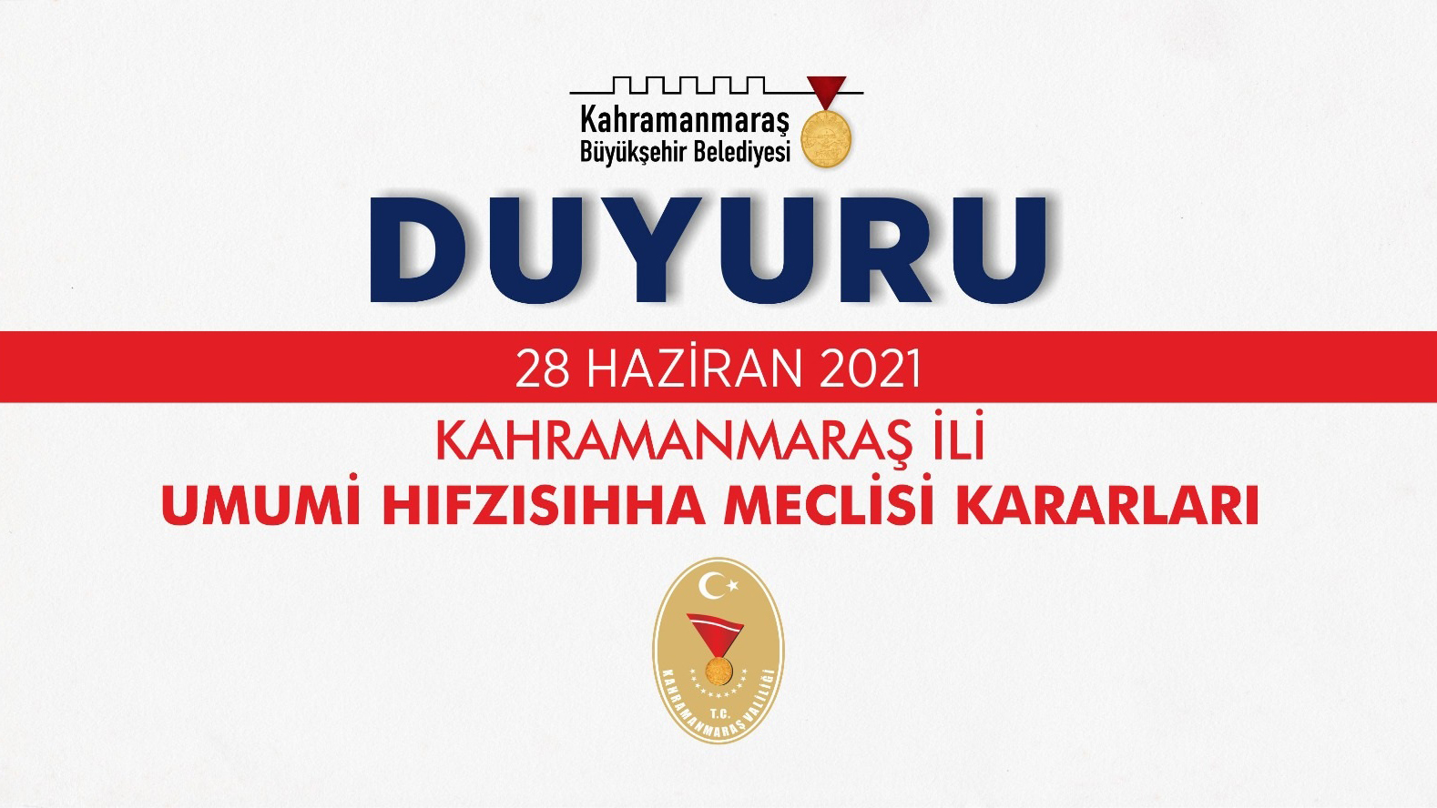 Kahramanmaraş İl Umumi Hıfzıssıhha Meclisi 28 Haziran 2021 günü saat 10.00’da Vali Ömer Faruk COŞKUN Başkanlığında Valilik Toplantı Salonunda toplanarak aşağıdaki kararları almıştır. İçişleri Bakanlığımızın 27.06.2021 tarih ve 10530 sayılı Genelgesi doğrultusunda, salgının seyrinde yaşanan gelişmeler ile Sağlık Bakanlığı ve Koronavirüs Bilim Kurulunun tavsiyeleri, Sayın Cumhurbaşkanımızın başkanlığında toplanan 21 Haziran 2021 tarihli Cumhurbaşkanlığı Kabinesinde ele alınarak; kademeli normalleşme sürecinin üçüncü etabı kapsamında aşağıdaki tedbirlerin 1 Temmuz 2021 Perşembe gününden itibaren hayata geçirilmesi gerektiği değerlendirilmiştir.