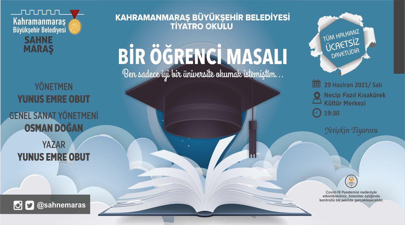 Kahramanmaraş Büyükşehir Belediyesi tarafından düzenlenen “Sahne Maraş” tiyatro okulu öğrencileri bir oyunla daha seyirciyle buluşacak. Oyuncu adaylarının hazırlıklarını tamamladığı “Bir Öğrenci Masalı” adlı yeni oyun yetişkin yaş grubuna yönelik sahnelenecek. Yunus Emre Obut’un yazığı ve yönettiği tiyatro oyunu 29 Haziran Salı günü (yarın) saat 19.30’da seyirciyle buluşacak. Necip Fazıl Kültür Merkezi’nde sahnelenecek olan oyunun biletleri de aynı merkezden ücretsiz olarak temin edilebiliyor.