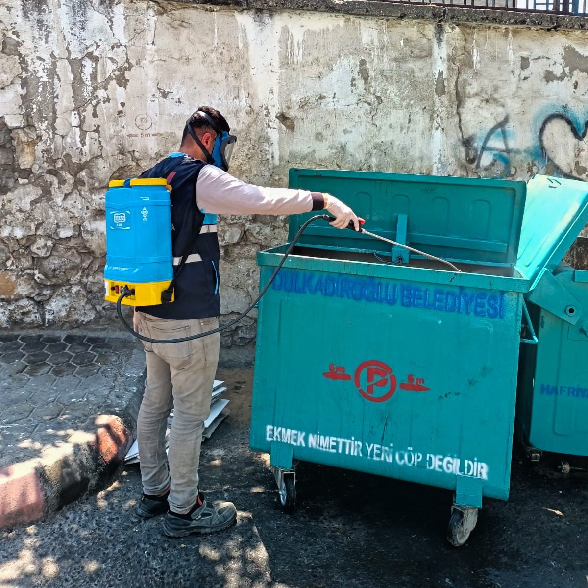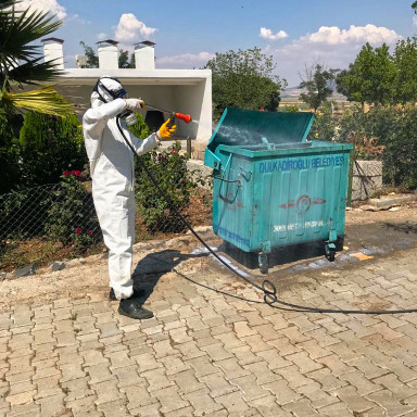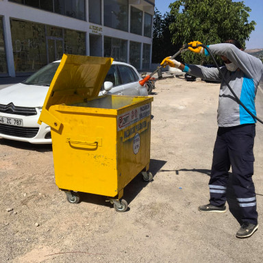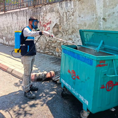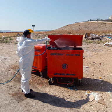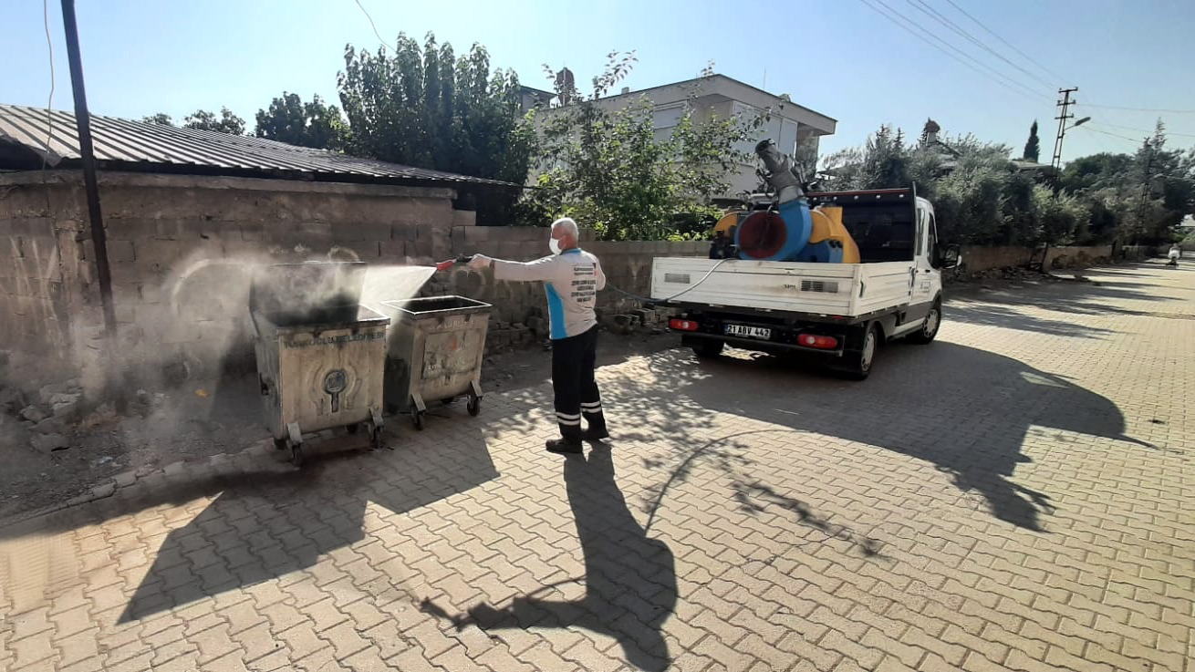 Kahramanmaraş Büyükşehir Belediyesi, 54 araç ve 110 personel ile çöp konteynerlerinden hayvan satış noktalarına kadar tüm alanlarda ilaçlama çalışmalarını sürdürüyor.
