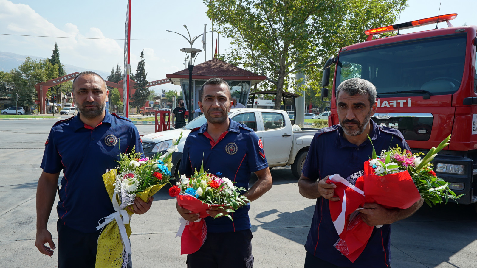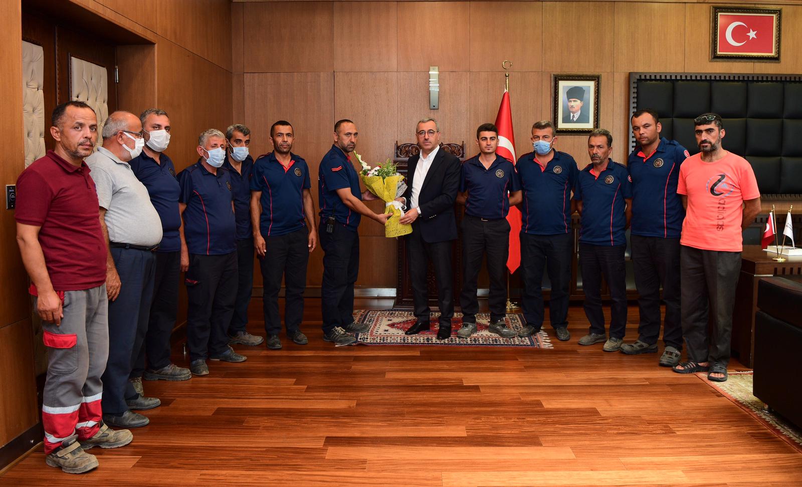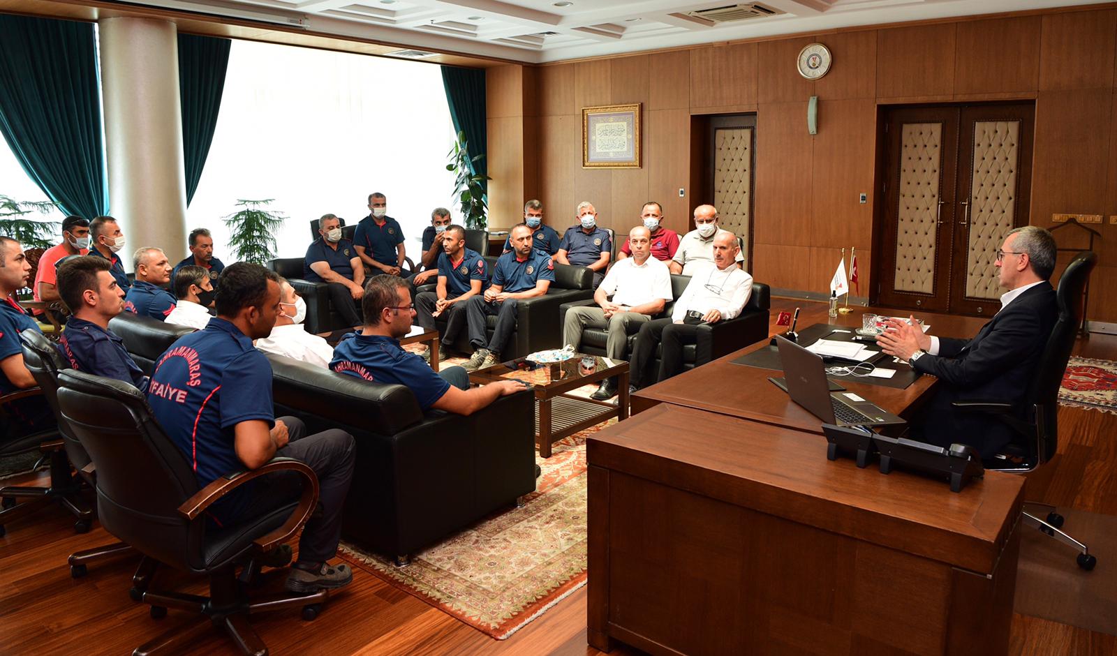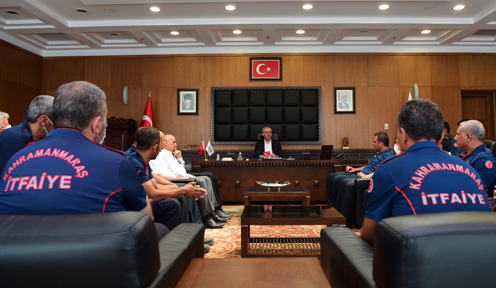 Kahramanmaraş Büyükşehir Belediye Başkanı Hayrettin Güngör, yangın bölgelerinde söndürme çalışmalarına destek veren itfaiye erleriyle bir araya geldi. Başkan Hayrettin Güngör, “Geçtiğimiz günlerde ülkemizde çok büyük bir yangınla karşı karşıya kalmıştı.Türkiye’miz bütün kurumları, itfaiye teşkilatları, gönüllüleri, orman teşkilatlarıyla müdahale etti. Biz de Kahramanmaraş İtfaiyesi olarak 6 araç 13 personelimizle illerimize buradan destek verdik. İtfaiye teşkilatımıza bölgede gerçekleştirdikleri başarılı çalışmalar sebebiyle teşekkür ediyorum. Dua ediyoruz ve diyoruz ki afetler olmasın” ifadelerini kullandı.