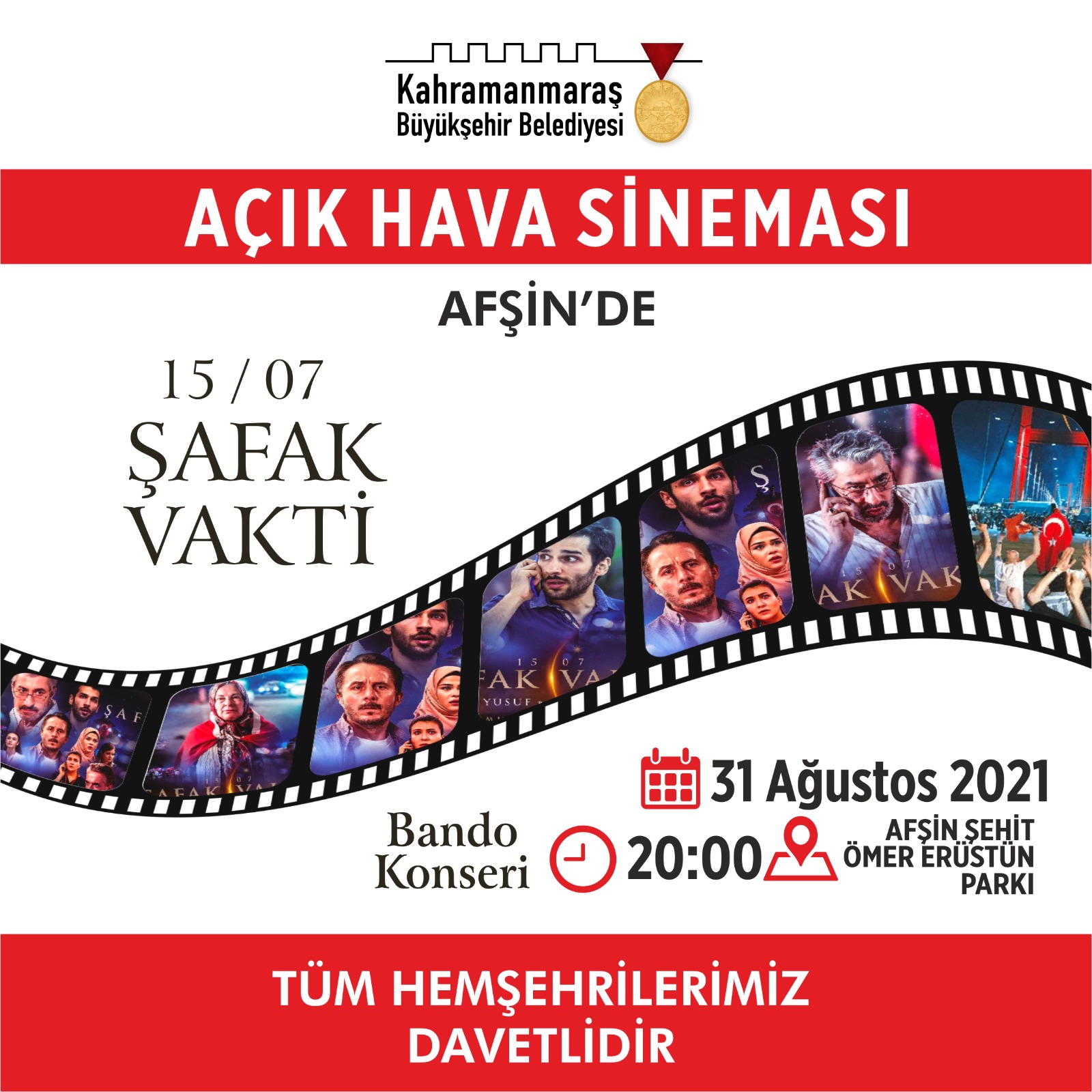 31 Ağustos Salı - Afşin - Şehit Ömer Erüstün Parkı- 19.00 Konser / 20.00 Film Gösterimi