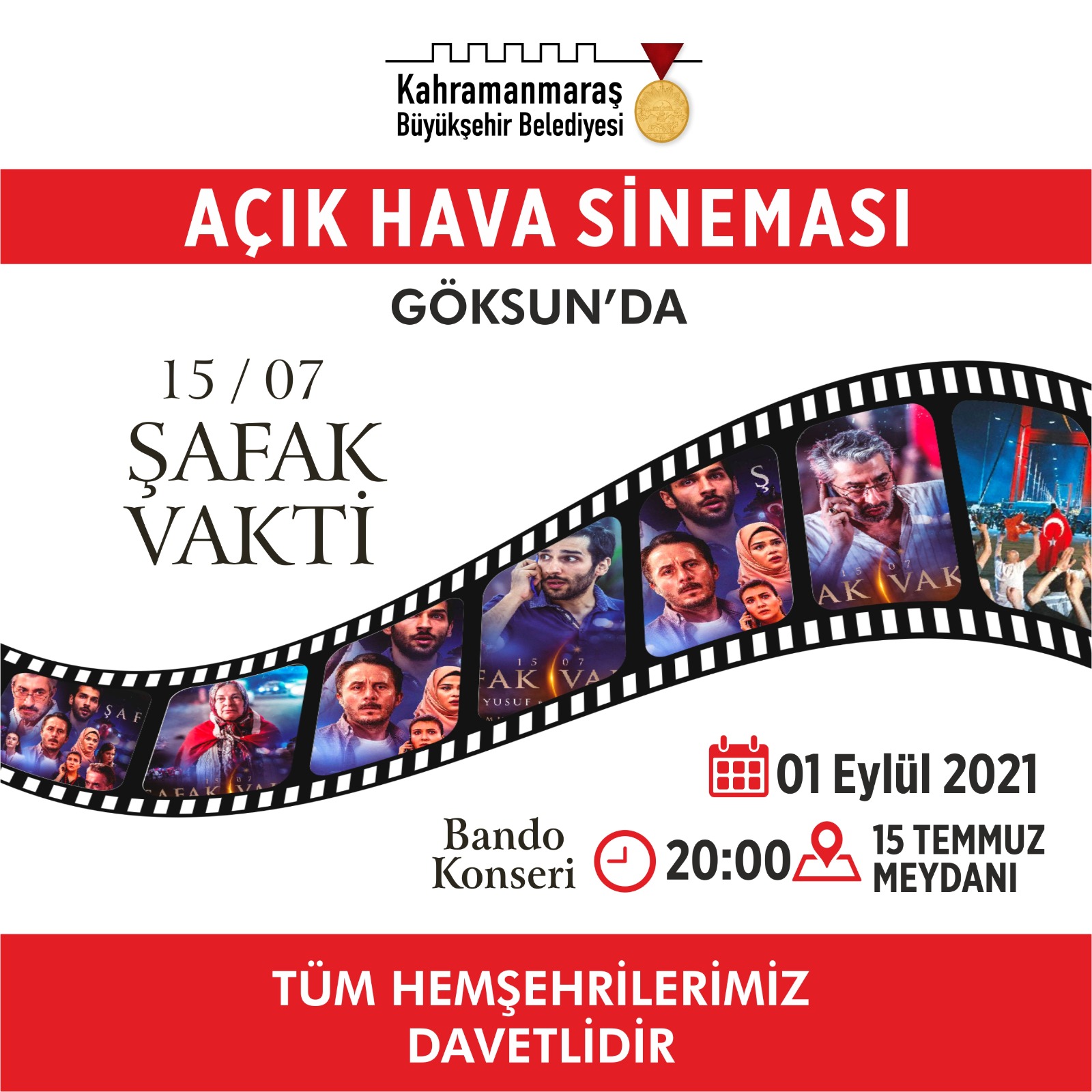 01 Eylül Çarşamba - Göksun- 15 Temmuz Meydanı - 19.00 Konser / 20.00 Film Gösterimi