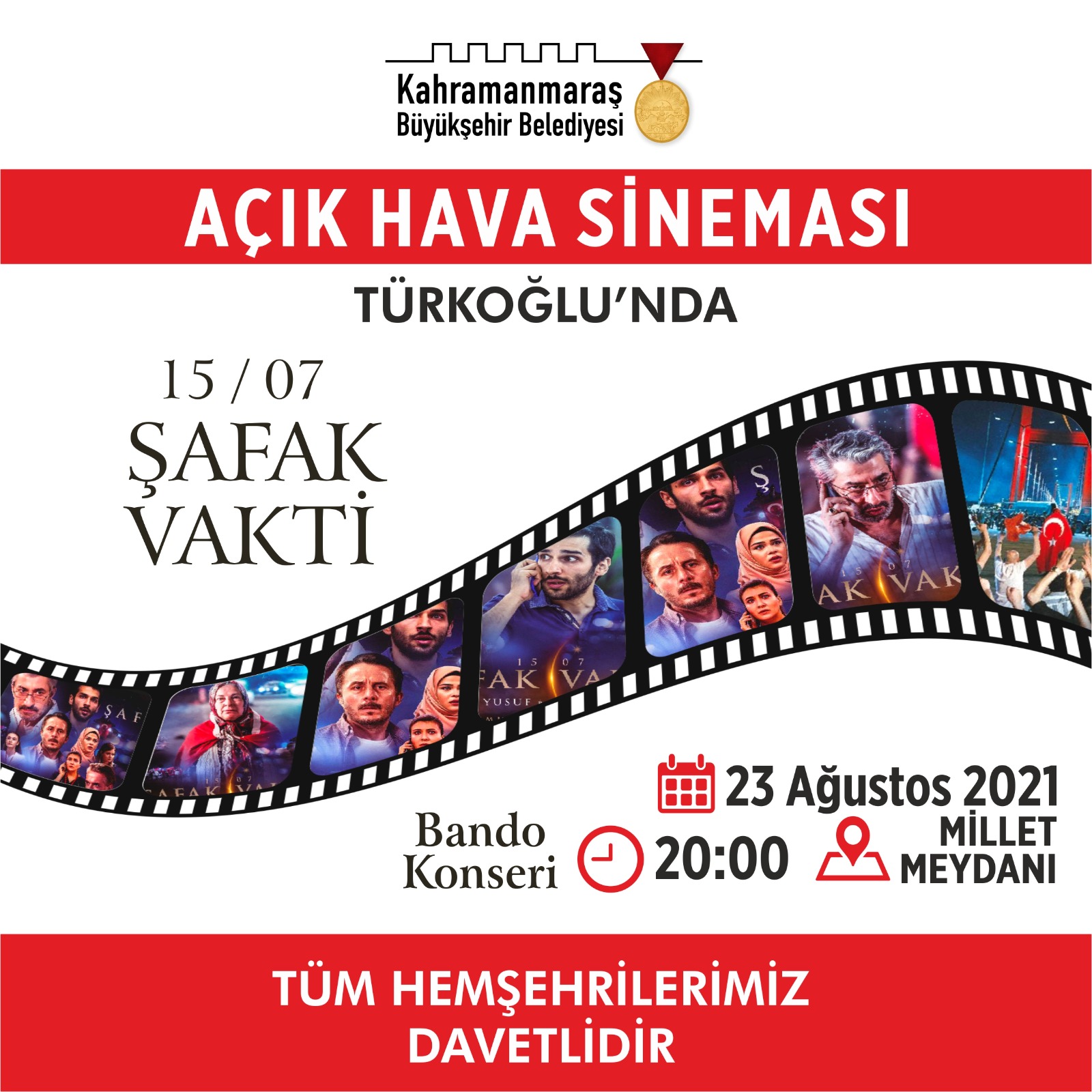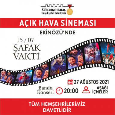 Kahramanmaraş Büyükşehir Belediyesi tüm ilçelerde Açık Hava Etkinlikleri düzenliyor. Programlar kapsamında Büyükşehir Belediyesi Bando Takımı konseri ve Şafak Vakti filminin gösterimi yapılacak. Ücretsiz etkinliklerle, 15 Temmuz’da yaşanan milli direnişi konu edinen Şafak Vakti adlı film vatandaşların beğenisine sunulmuş olacak. Belirlenen takvime göre ilk etkinlik 23 Ağustos Pazartesi günü Türkoğlu Millet Meydanı’nda gerçekleştirilecek. Program kapsamında 19.00’da Büyükşehir Belediyesi Bando Takımı performansının ardından 20.00’da Şafak Vakti filmi açık havada seyirciyle buluşacak. Gerçekleştirilecek etkinlik ile ilgili olarak Büyükşehir Belediyesi Kültür Turizm ve Spor Dairesi Başkanlığı tarafından yapılan açıklamada ücretsiz etkinliklere tüm vatandaşların davet edildiği belirtildi.