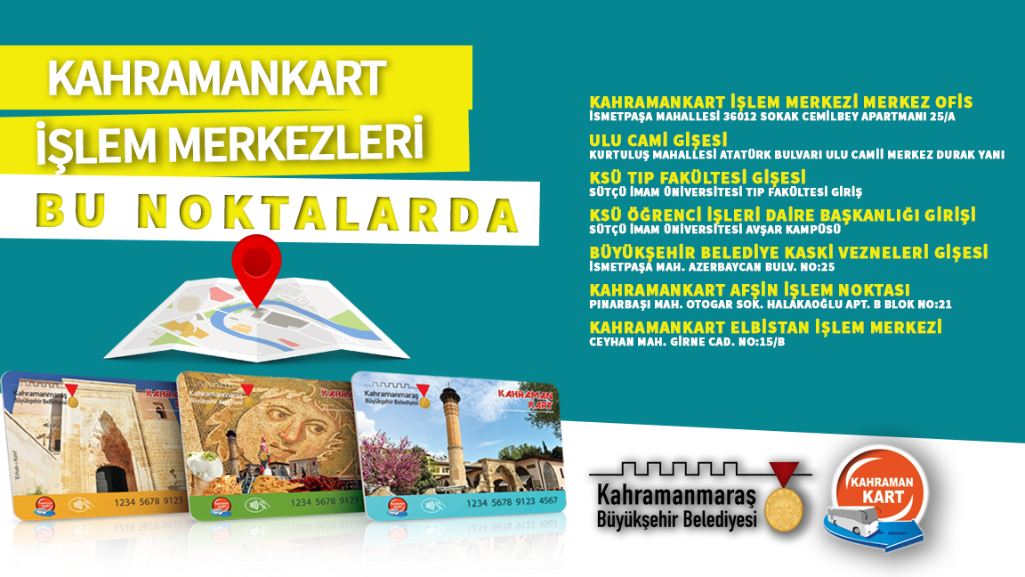 Kahramanmaraş Büyükşehir Belediyesi’nin toplu taşıma araçlarında kullanılan Kahramankart işlemleri şehrin birçok işlem merkezleri aracılığıyla kolayca yapılabiliyor. Toplamda 4 ilçede 7 farklı noktada yer alan merkezlerden yeni kart çıkarma, vizeleme ve daha birçok işlem gerçekleştirilebiliyor. Kentin merkez ilçelerinden Onikişubat’ta KSÜ Tıp Fakültesi Gişesi ve KSÜ Öğrenci İşleri Daire Başkanlığı’nda yer alan iki işlem merkezinin yanı sıra, Dulkadiroğlu ilçesinde Kahramankart İşlem Merkezi Merkez Ofis, Ulu Camii Gişesi ve Kahramanmaraş Büyükşehir Belediyesi Ana Hizmet Binası KASKİ Vezneleri gişesi başta olmak üzere üç noktadan işlem yapılabiliyor. İlçelerde ise Elbistan’da Girne Caddesi ve Afşin Pınarbaşı Mahallesi’nde yer alan merkezlerde de kart işlemlerine yönelik hizmet veriliyor.