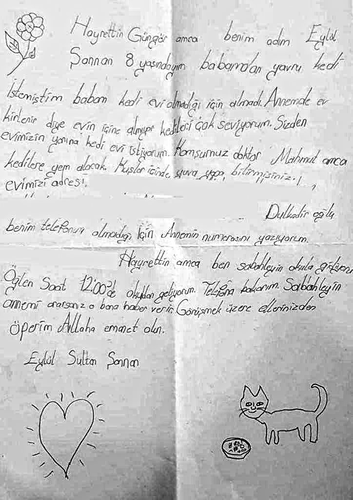 Kahramanmaraş Büyükşehir Belediye Başkanı Hayrettin Güngör, 4 Ekim Hayvanları Koruma Günü’nde özel bir ziyaret gerçekleştirdi. Bir süre önce 8 yaşındaki Eylül Sultan Şanlan Başkan Güngör’e bir mektup yazarak hayvan sevgisini dile getirmiş ve bir de talepte bulunmuştu. Yazdığı mektupta, “Hayrettin Güngör amca, babamdan kedi istemiştim ama kedi evi olmadığı için almadı. Annem de ev kirlenir diye evin içine almıyor. Kedileri çok seviyorum. Sizden evimizin yanına kedi evi istiyorum. Komşumuz doktor amca kedilere yem alacak. Kuşlar için de yuva yapabilir misiniz?” talebini ileten minik Eylül’ün hayali gerçekleştirildi.