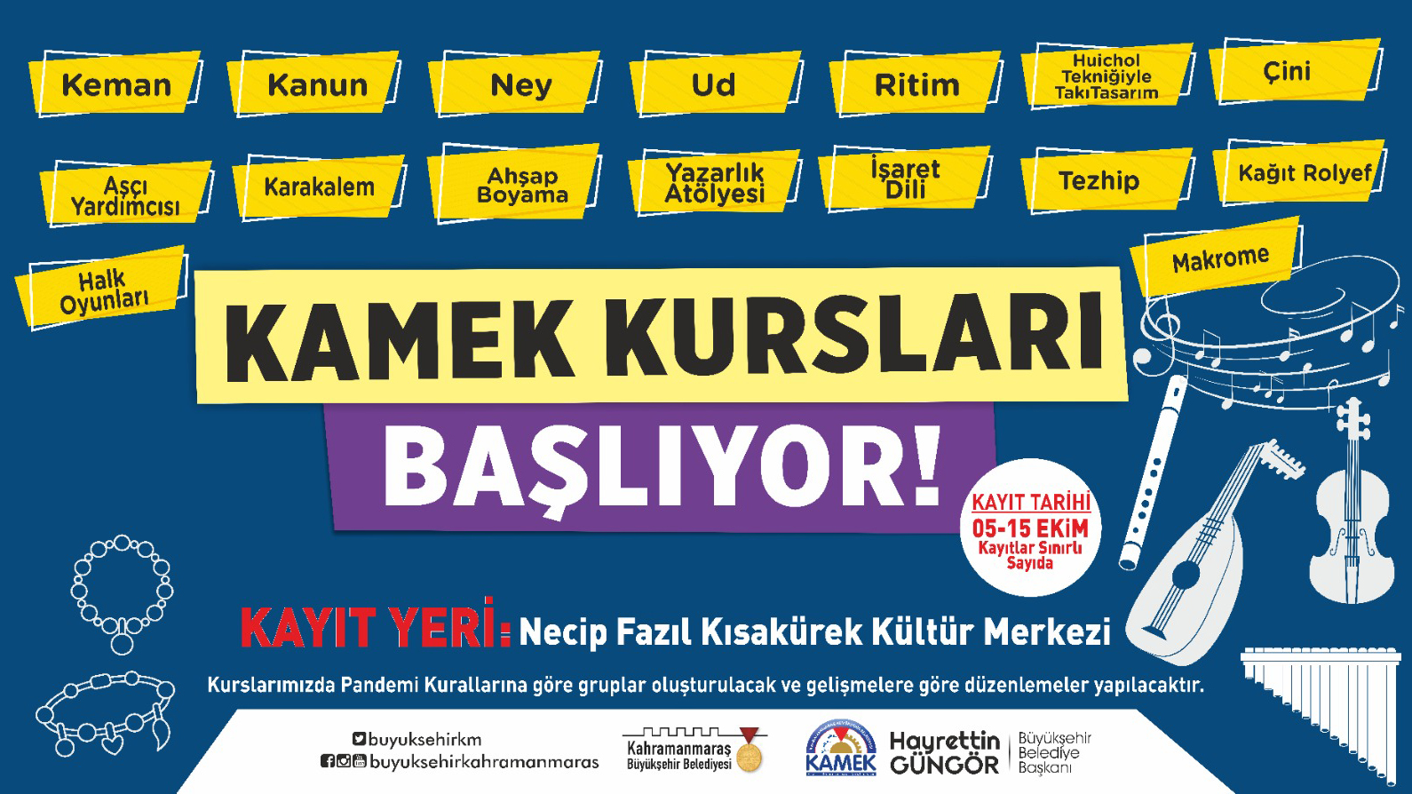 Kahramanmaraş Büyükşehir Belediyesi tarafından düzenlenen Meslek Edindirme ve Sanat Eğitimi Kursları (KAMEK) başvuruları başladı. Uzman eğitmenlerce toplamda 16 branşta verilecek eğitimler arasında; Keman, Kanun, Ney, Ud, Ritim, Huichol Tekniğiyle Takı Tasarım, Çini, Aşçı Yardımcılığı, Karakalem, Ahşap Boyama, Yazarlık Atölyesi, İşaret Dili, Tezhip, Kağıt Rolyef, Halk Oyunları ve Makrome yer alıyor. Pandemi kuralları çerçevesinde sınırlı sayıda katılımcının yer alabileceği eğitimlere başvurular Necip Fazıl Kısakürek Kültür Merkezi’nden yapılabiliyor. Eğitimler için belirlenen son başvuru tarihi ise 15 Ekim Cuma.