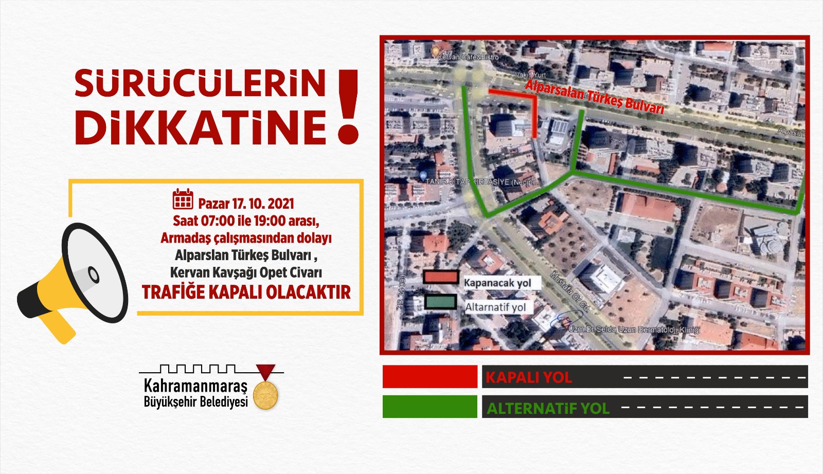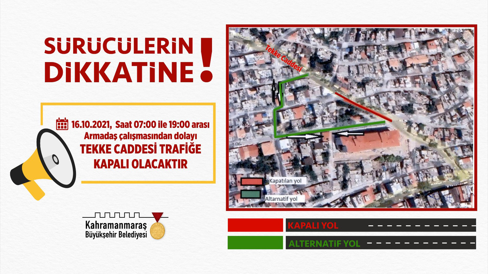 Kahramanmaraş Büyükşehir Belediyesi, gerçekleştirilecek doğalgaz çalışmaları dolayısıyla iki noktada trafiğin geçici olarak kapatılacağını duyurdu. Bu kapsamda, Onikişubat ilçesine bağlı Tekke Caddesi 16 Ekim Cumartesi günü saat 07.00 ila 19.00 arasında trafiğe kapalı olacak. Ulaşım alternatif olarak Ahmet Gedemenli Caddesi’nden sağlanabilecek. Trafiğe kapalı olacak bir diğer arter ise Alparslan Türkeş Bulvarı olacak. Kervan Kavşağı ve Opet arasındaki bölümün 17 Ekim Pazar günü saat 07.00 ila 19.00 arası kapalı olacağı bölgeye Mustafa Or Caddesi’nden ulaşılabilecek.
